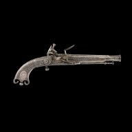 Jackson Mortimer (1762-1834) who was in business with Meyer was one of the top Scottish Gunmakers & Meyer supplied military apparel. The pair of flintlock pistols have a 116 bore, 4 inch three-stage barrels of silver with ferrous cores, the stocks of silver. Faceted at the breeches, round in the mid-stage and dodecagonal at the muzzle, chased all-over with scrolling acanthus and thistle details and with a thistle in an oval panel to the tops. Birmingham proof marks. Steel locks with waterproof pans and roller bearing frizzen springs, engraved with scrolls and geometric borders and inscribed ”MEYER & MORTIMER”; silver stocks engraved en suite to the barrels and with thistles and trophies of arms in oval pan. Measurements Each pistol Overall length 19.5cm Mortimer businesses in Edinburgh:- Gray”s annual directory and Edinburgh almanac. Edinburgh : J. Gray, 1832-1837. The following show the shop numbers, possibly Princes Street Edinburgh:-