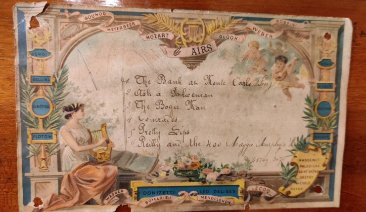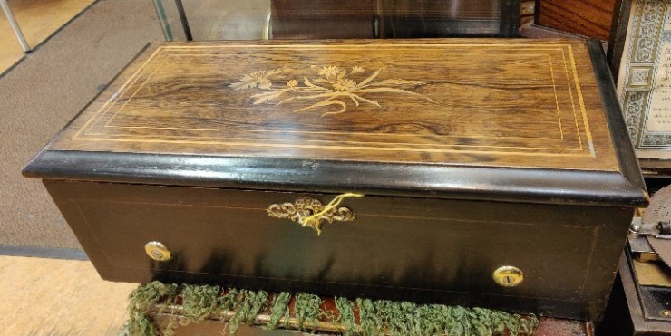 Music Box, 19th century, inlaid rosewood. Plays 8 airs.