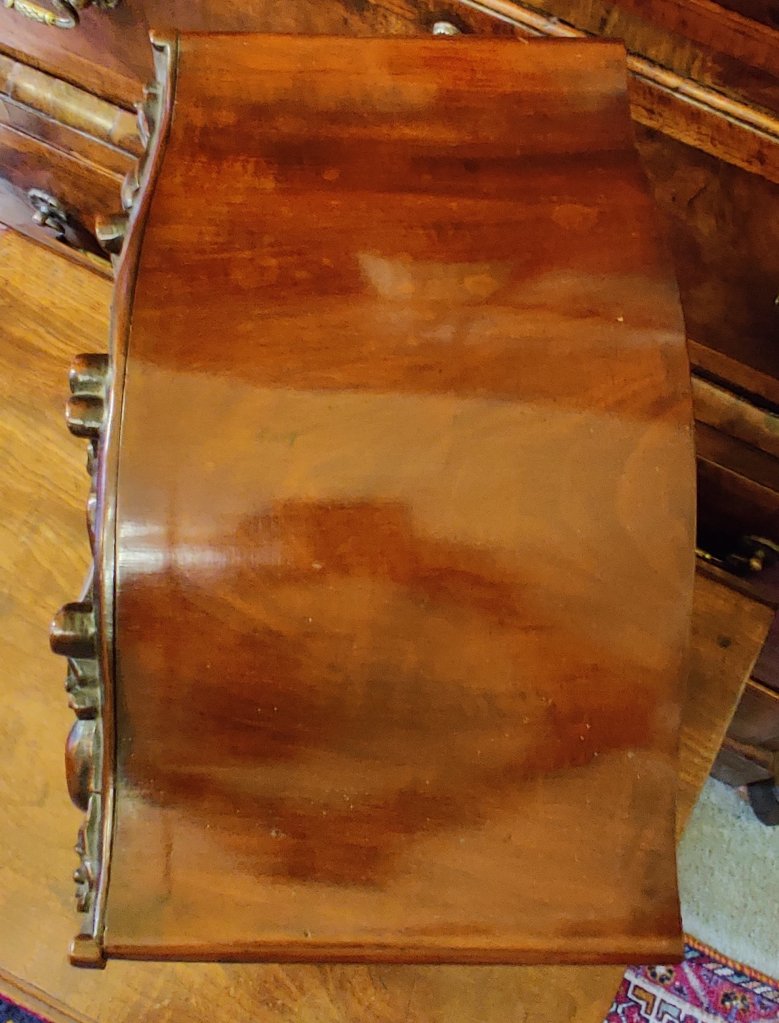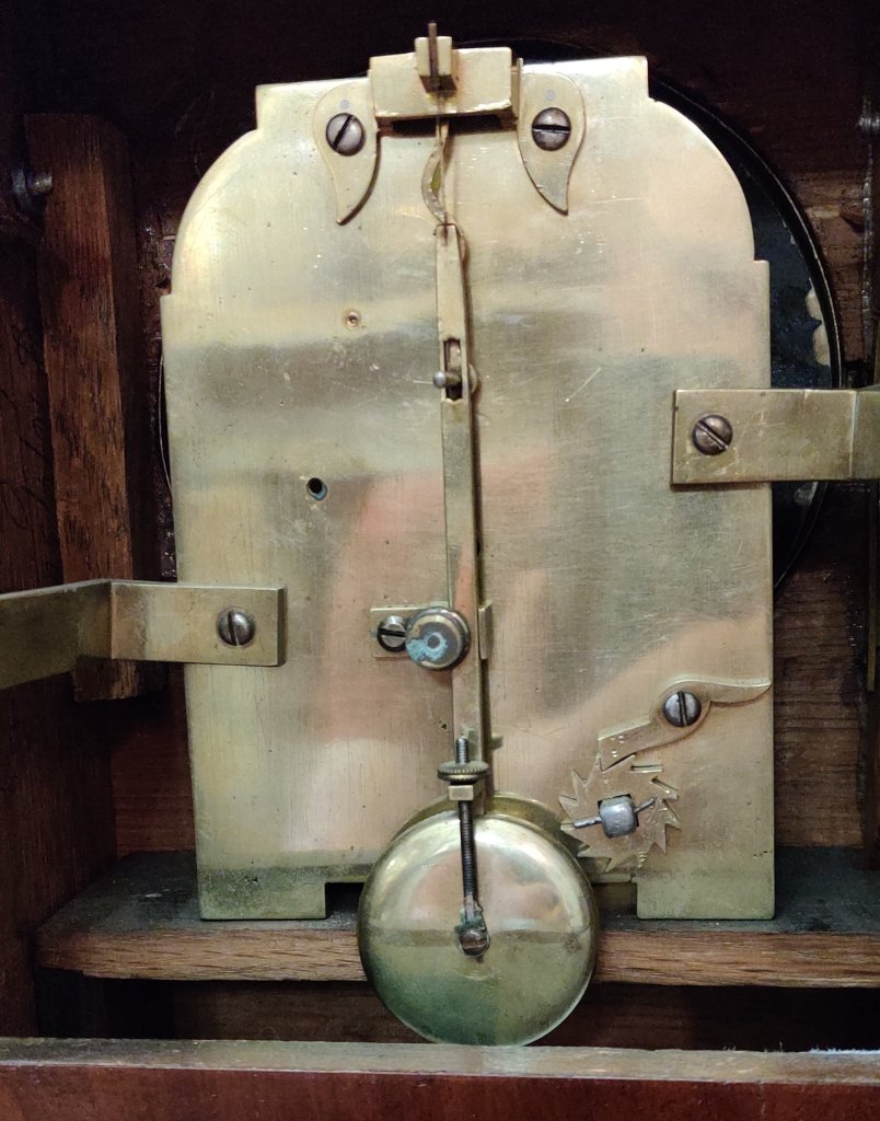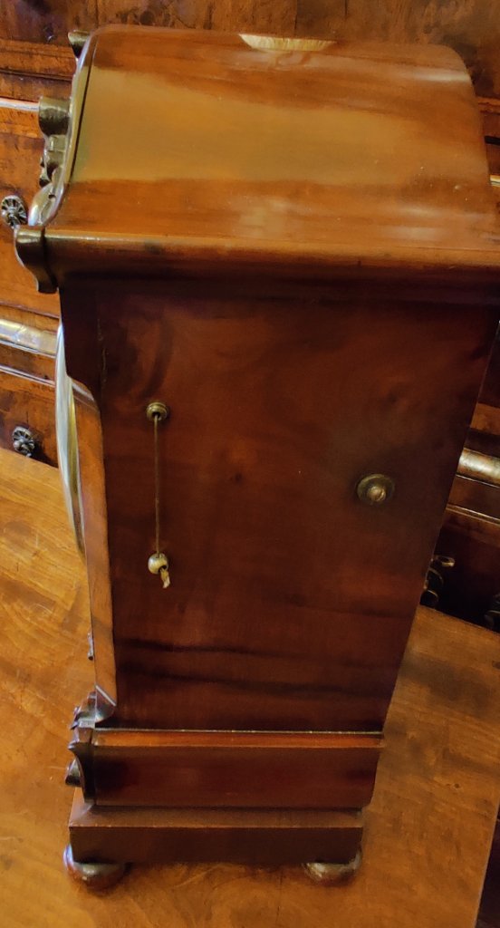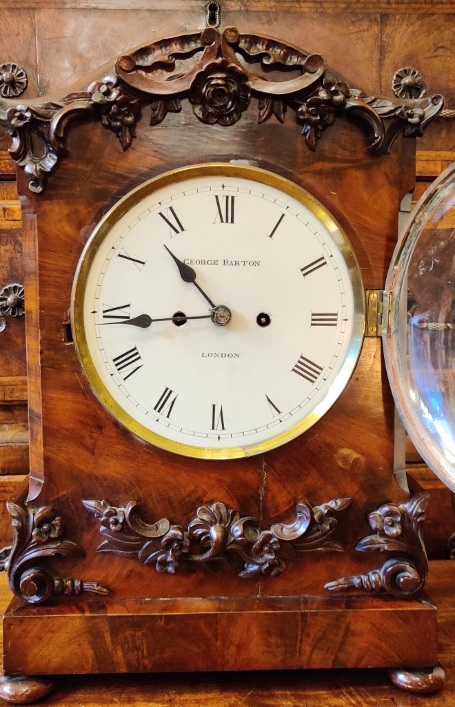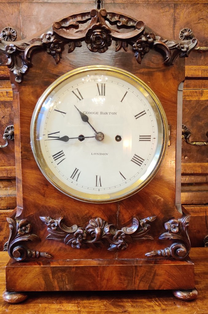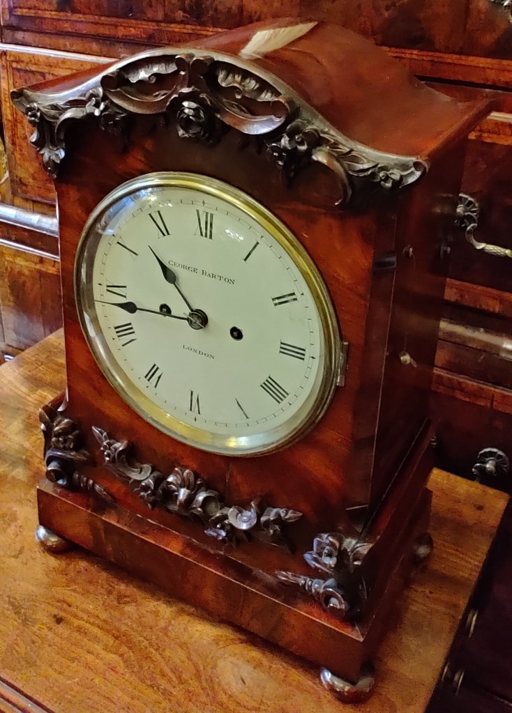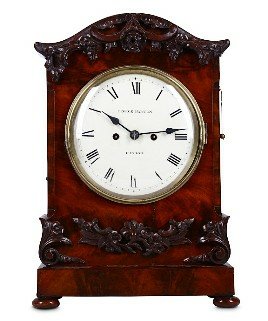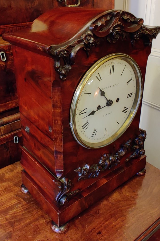 An English Figured Mahogany William IV bracket clock. Double chain fusee movement, striking the hours and with pull repeat with adjustable pendulum. The pagoda top carved with C scrolls and roses, with similar carvings below and raised on a plinth base on 4 bun feet. The maker, signed on the dial “George Barton London”. George Barton of London is listed in Baillie’s Watchmakers and Clockmakers of the World, as having registed a clock in 1863. Measurements 46cm high X 32cm wide x 19cm deep.