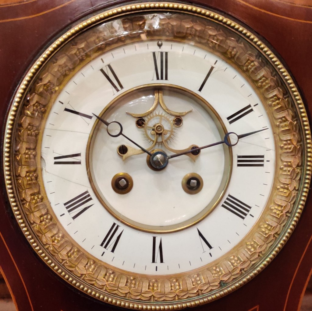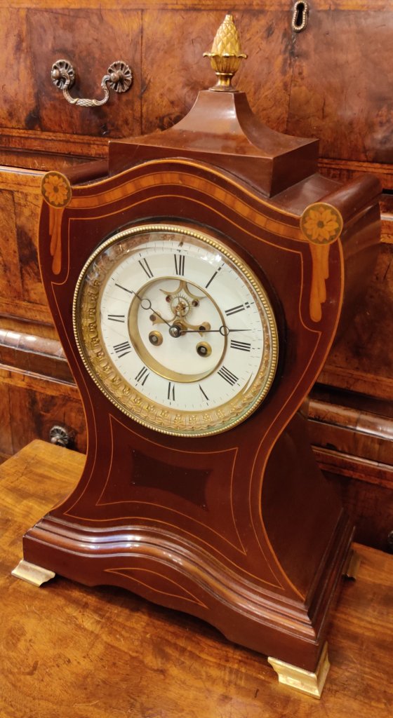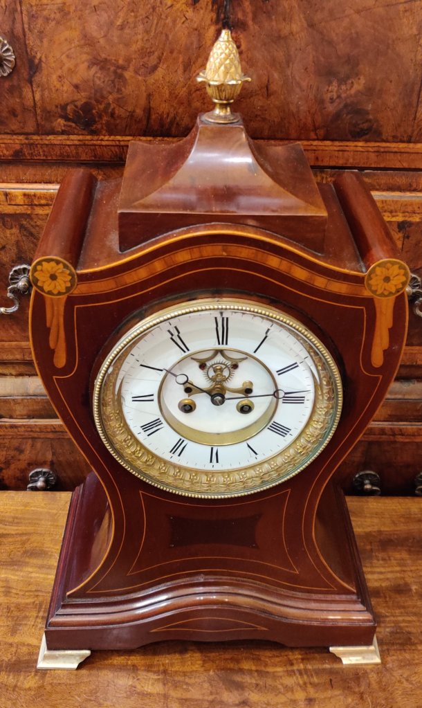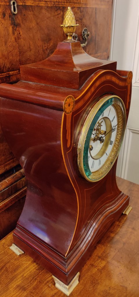Large Board Room style Inlaid Mahogany French Clock. With Pineapple finial and Moon hands. 8 day with Brocot visible escapement, striking on a gong, on the hour and the half. 19th century. Circa 1890. Measurements: 55h x 32.5w x 19.5 depth cm.