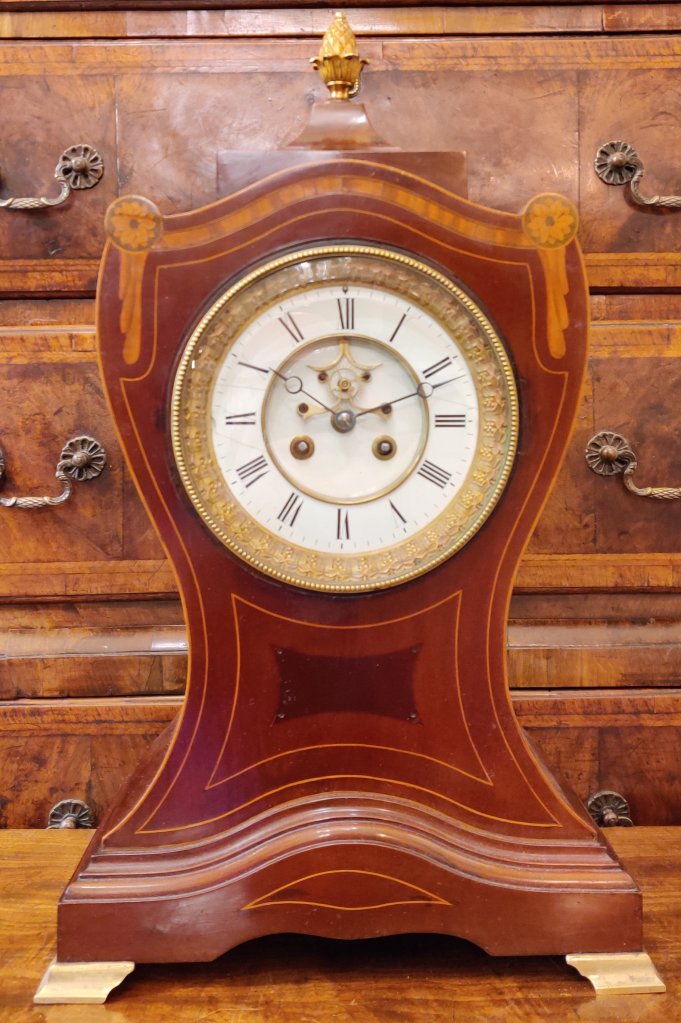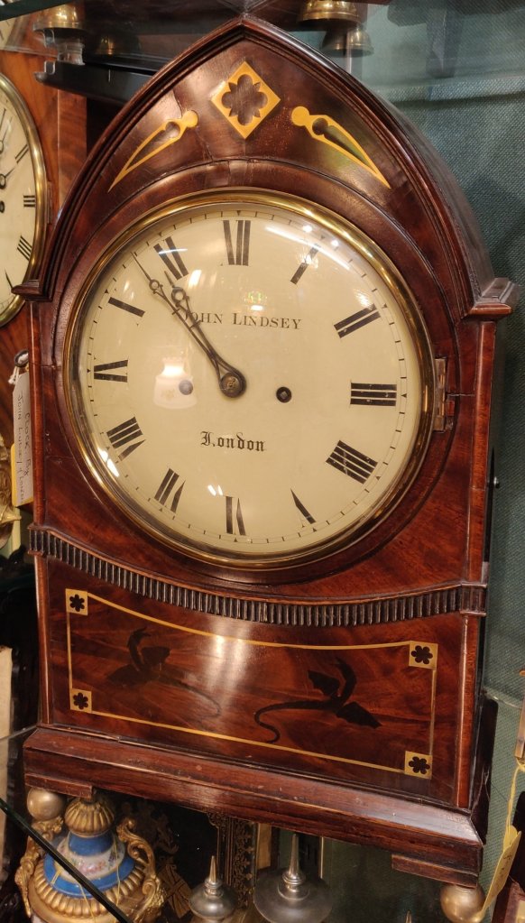 Georgian Lancet Top Bracket Clock. Circa 1815. Figured Mahogany case with brass inlay and ball feet. A cast brass bezel to the convex dial with blued steel hands. 8 day movement with twin fusee and anchor escapement, striking the hour on a bell. The enamel white dial signed “John Lindsey London“. John Lindsey of London is listed in Baillie’s “Watchmakers and Clockmakers of the World”, as being a member of the prestigious Clockmakers Company between 1806-1828.