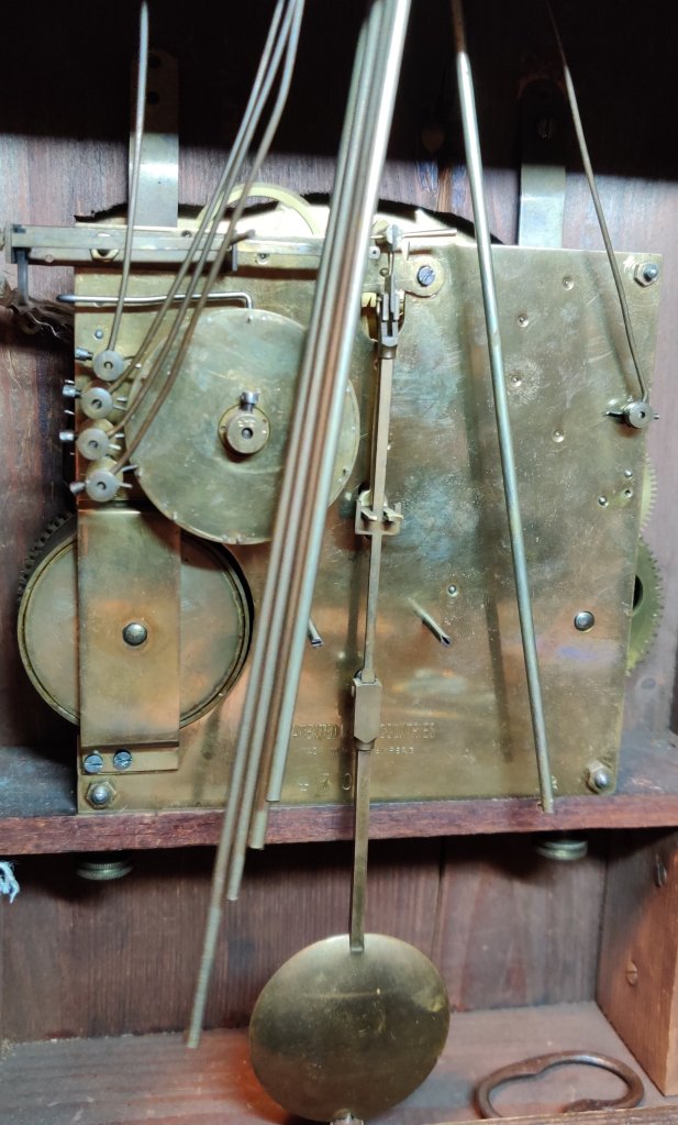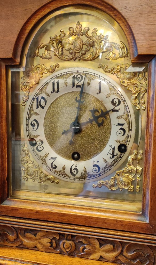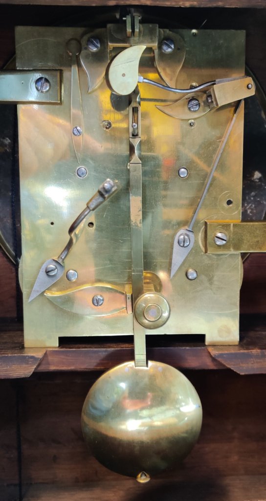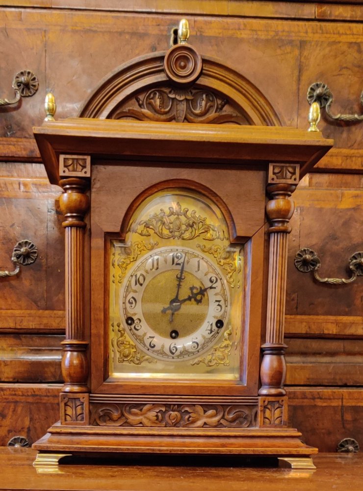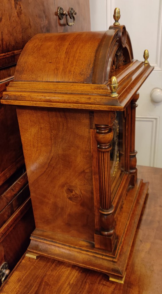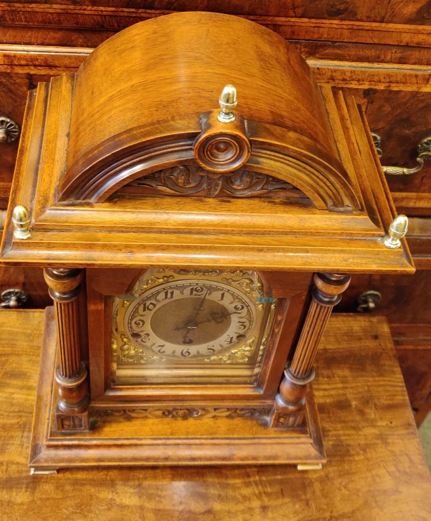 Large Board Room Walnut Westminster Chime Clock. 19th century. 8 day movement, chiming on the quarters. Circa 1880. Engraved “Made in Wurttenberg”. Measurements: 49h x 32w x 21 depth cm.