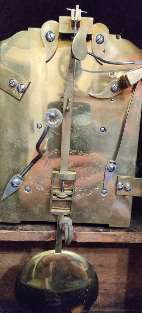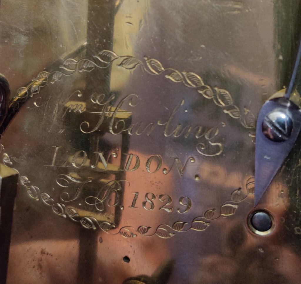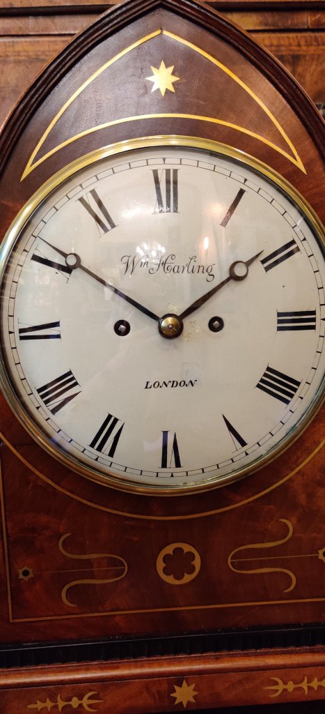 Circa 1820. The case with choice veneers with brass inlay. Brass lion head side handles and well cast side sound fretwork panels. Brass ball feet. A cast brass bezel to the convex dial with blued steel hands. Signed on the dial and engraved on the movement by the Maker “Wm Harling London, TB 1829”. William is listed in Baillie’s Watchmakers and Clockmakers of the World to have made a watch in 1761. Pendulum to the double fusee mechanism of 8-day duration, striking the hours on a bell. Pull repeating cord. Measurements: 47h x 29w x 17. 5 depth cm.