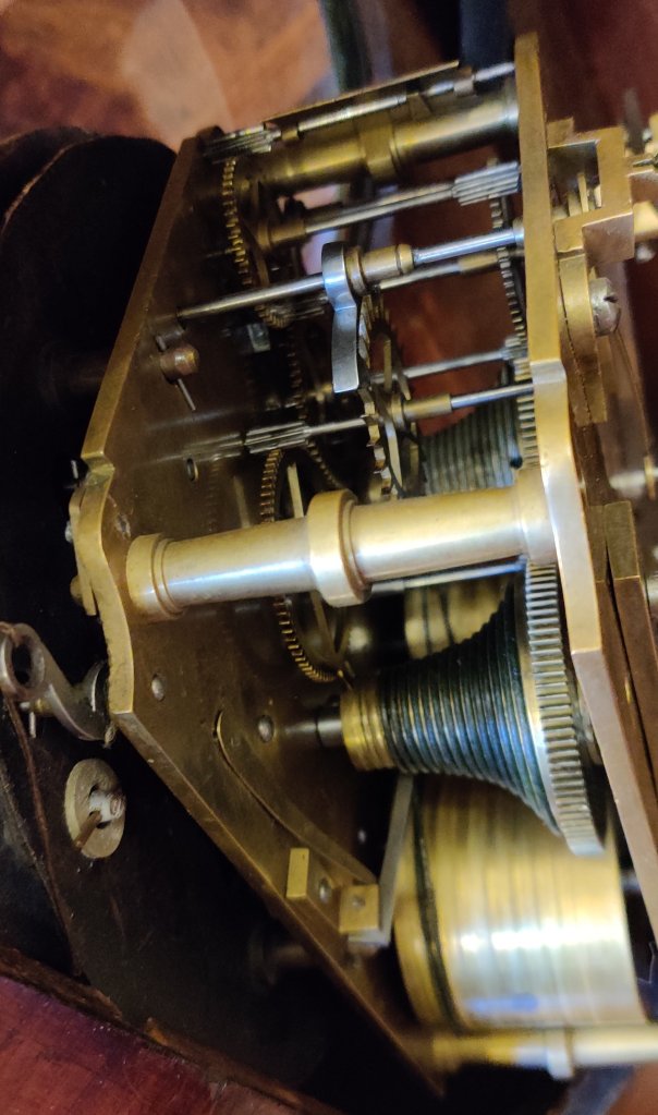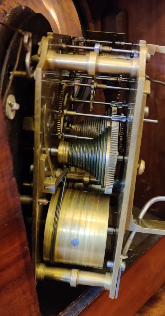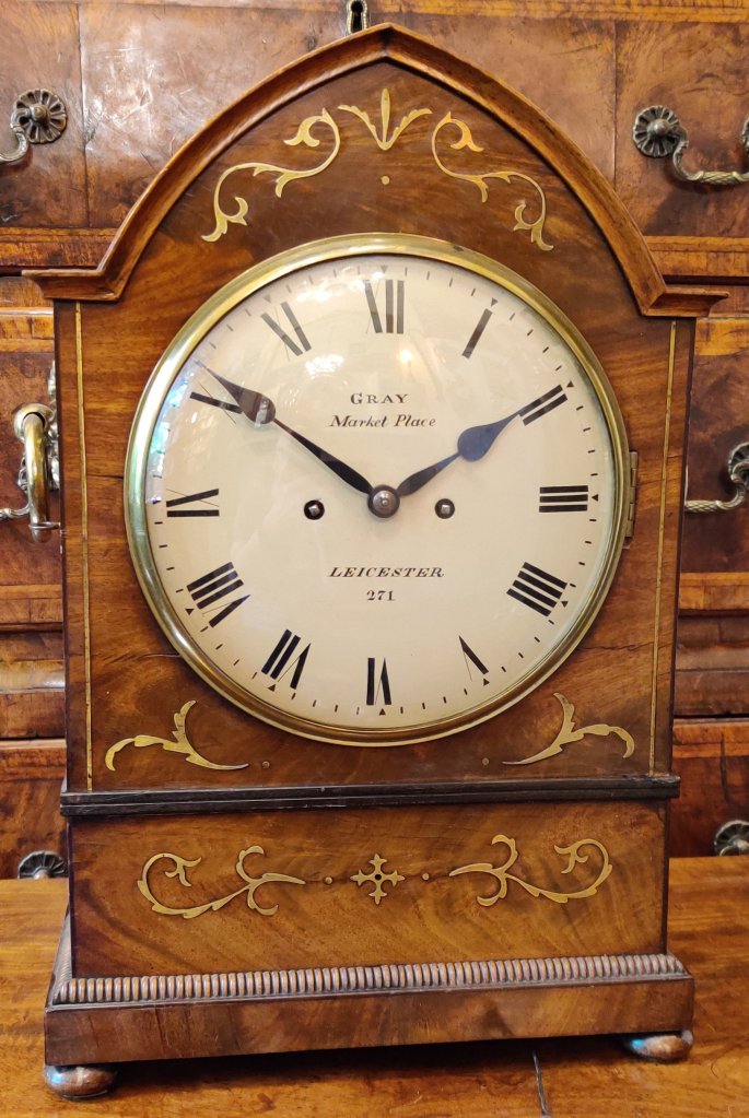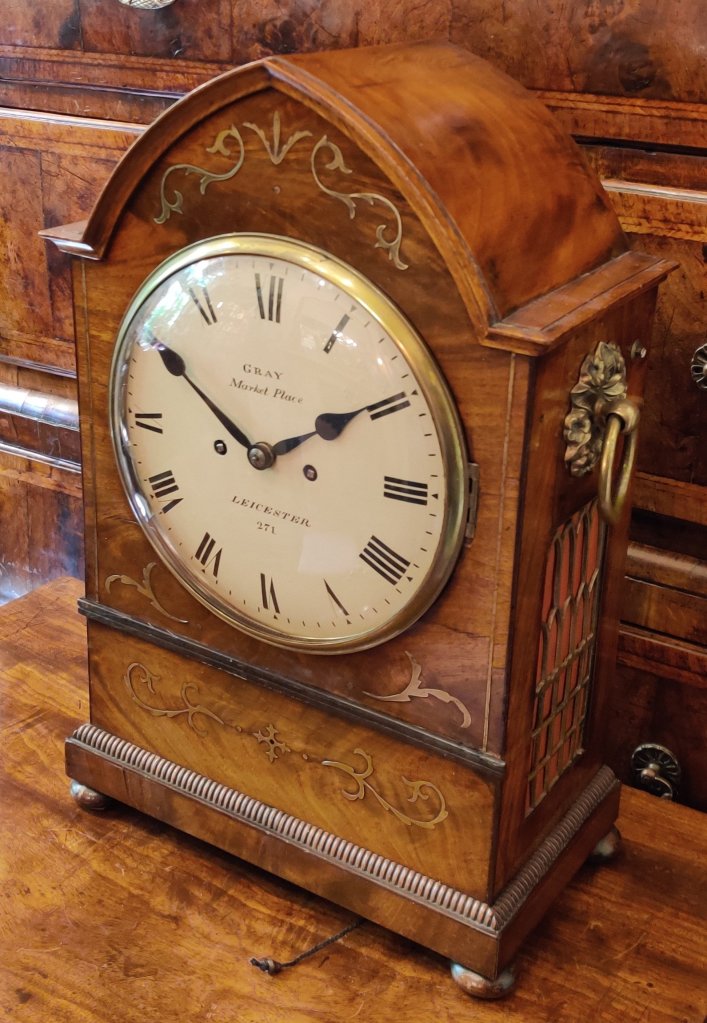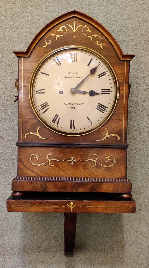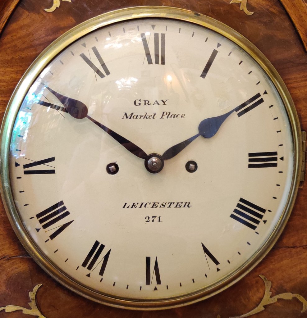 Circa 1820. The case with choice veneers with brass inlay. A cast brass bezel to the convex dial with blued steel hands. Signed by the Maker “Gray, Market Place, Leicester 271″. William Gray of Market Place, Leicester, is listed to have made a Long-case clock in 1825 and an English Lever watch. Brass side handles and well cast side sound fretwork panels. Bun feet, double fusee mechanism of 8-day duration, striking the hours on a bell. Pull repeat of the hour cord.