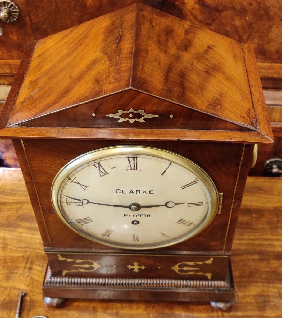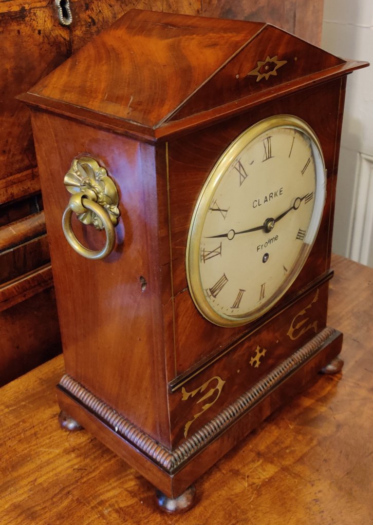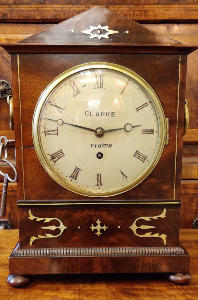 Georgian Regency Rosewood English bracket clock/timepiece. Circa 1810. The case with choice veneers with brass inlay. Brass side handles with bun feet. A cast brass bezel to the convex dial with blued steel hands. Signed on the dial “Clarke, Frome”. James Clarke of Frome is listed in Baillie’s Watchmakers and Clockmakers of the World to have made a watch in 1815.Pendulum to the single fusee mechanism of 8-day duration. 2 Keys to bezel & back door. Measurements: 35h x 24w x 15 depth cm.