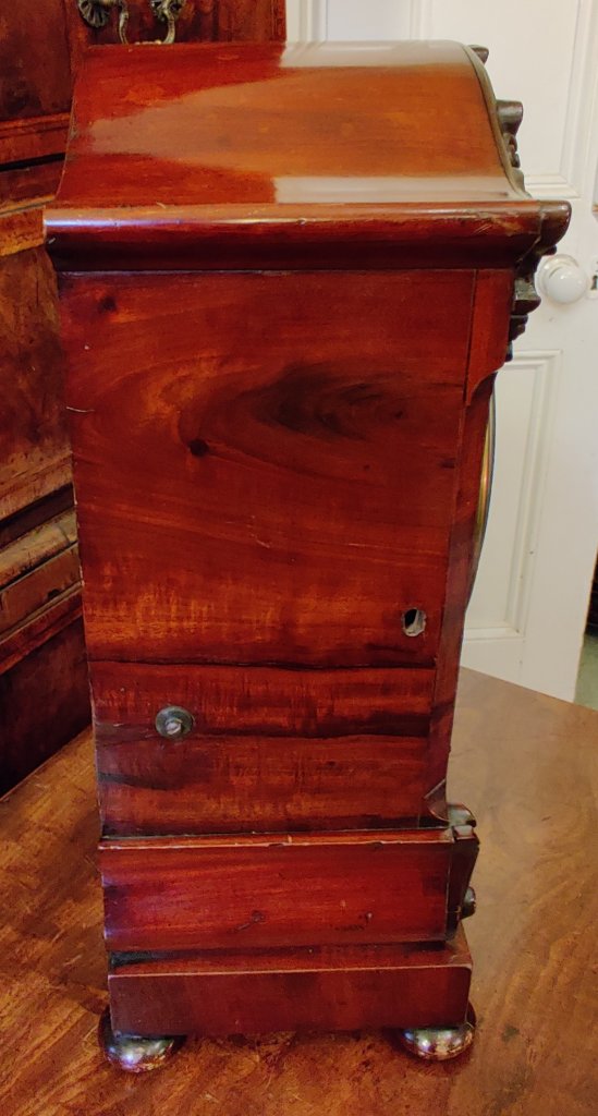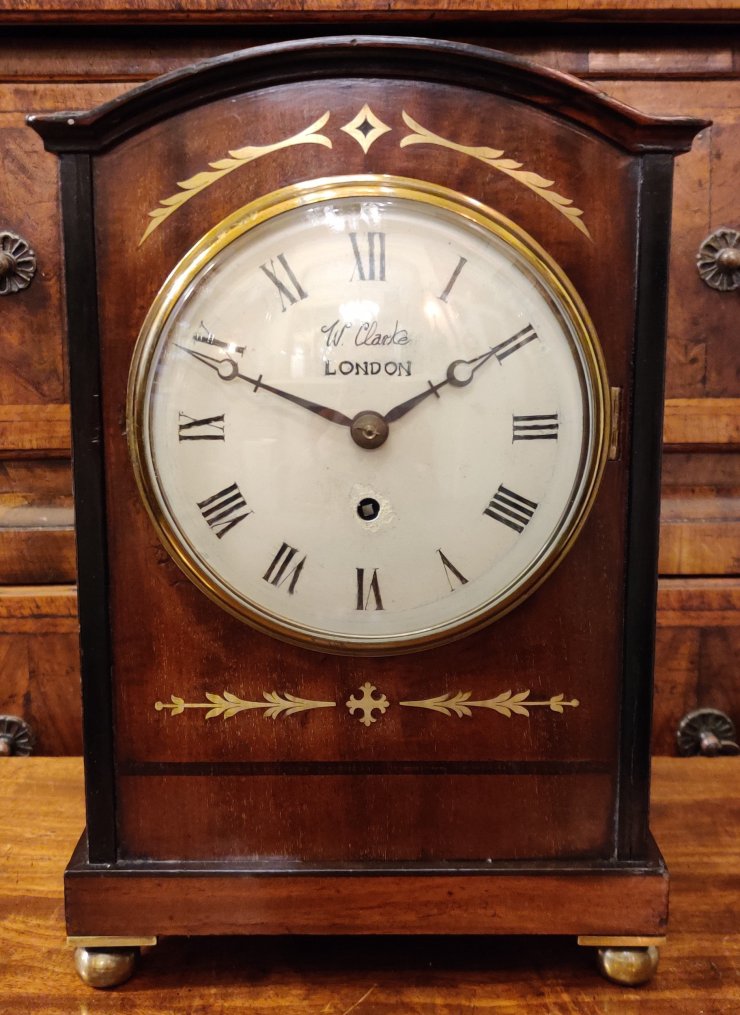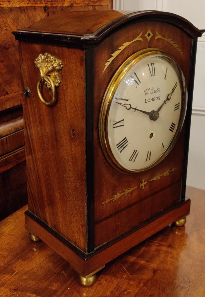 Regency Mahogany English bracket clock/timepiece. Circa 1815. The case with choice veneers with brass inlay. Brass side handles with ball feet. A cast brass bezel to the convex dial with blued steel hands. Signed on the dial “W Clarke, London”. William Clarke of London is listed in Baillie’s Watchmakers and Clockmakers of the World to have made a watch in 1819. Pendulum to the single fusee mechanism of 8-day duration. Key to bezel. Measurements: 34h x 23w x 14. 5 depth cm.