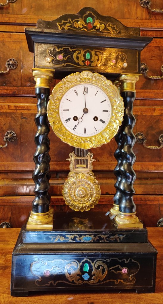 A French Portico Clock. Ebonised with brass gilded capitals. Maker stamped on the movement, “Japy Freres” of Paris”. circa 1880, 8 day. Outside countwheel, striking on a bell, on the hour and the half. Measurements: 50h x 25w x 14 depth cms.