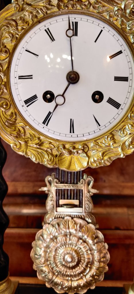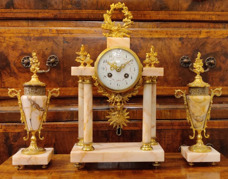 surmounted by a gilt bronze triumphal garland. Sunburst Pendulum referring to Louis XIV, the Sun King of France. 19th century. Circa 1880. 8 day movement with outside countwheel, striking on a bell, on the hour and the half. The garniture depicting classical urns. The movement stamped “Delorme and Cie”, Paris. Measurements the clock: 40cm high; 22cm wide; 9.5cm deep.