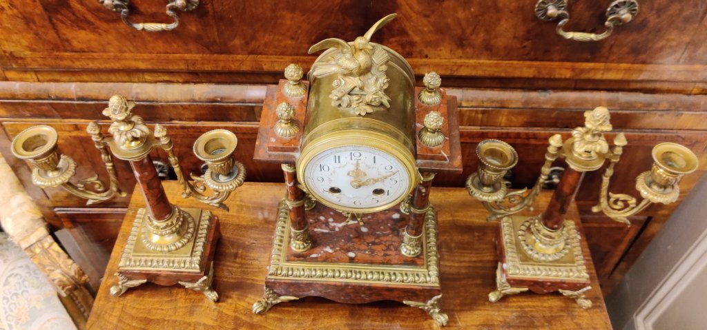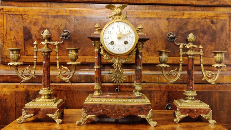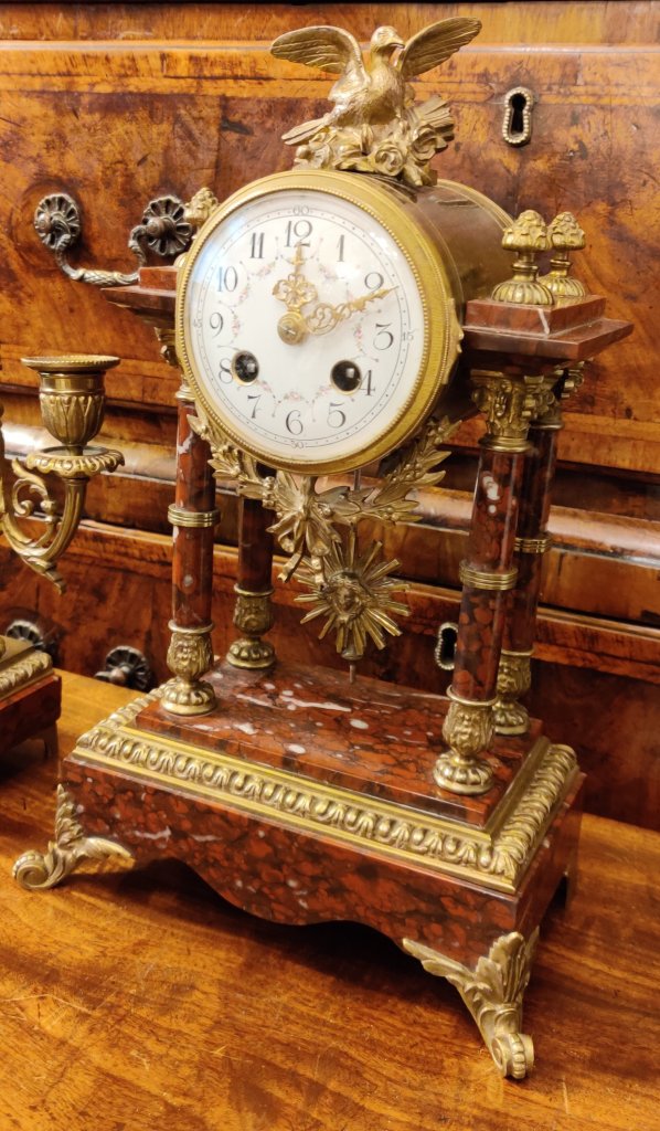 A rare French Red Marble clock Garniture, surmounted by a bronze dove sitting on a wheatsheaf. Sunburst Pendulum referring to Louis XIV, the Sun King of France. 19th century. Circa 1870. 8 day, striking on a bell, on the hour and half’s. Measurements the clock: 35cm high; 22cm wide; 12cm deep.