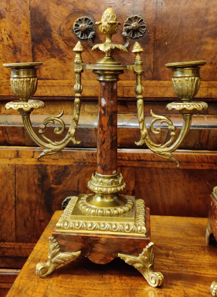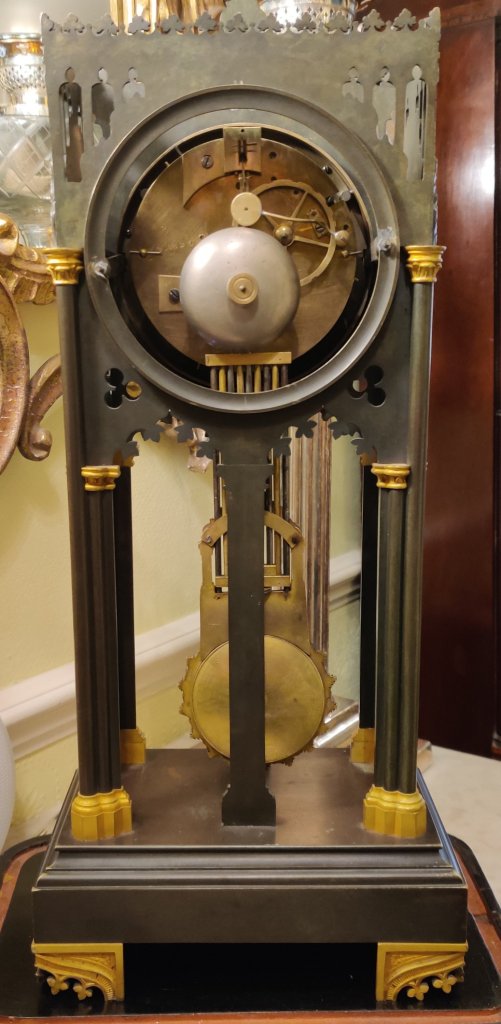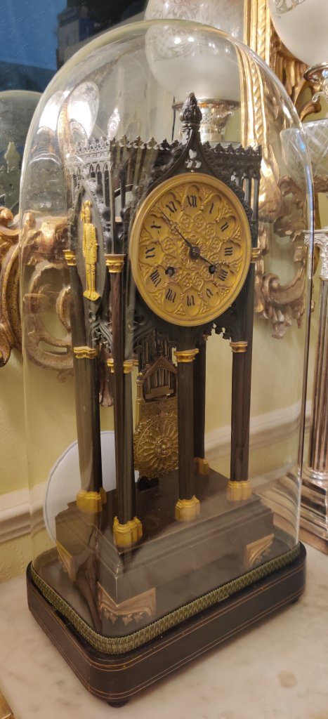 A Fine Cathedral clock, garniture in the style of Ferdinand Barbedienne, under original Dome. Gilt bronze gothic case with compensating pendulum. Circa 1870. 8 day movement with outside countwheel, striking on a bell, on the hour and the half. Garniture: With Neo- Grecian figure of Baccus. Bacchus was the Roman god of agriculture, wine and fertility. On rouge Griotte marble base with paw feet. Measurements Clock in dome: 59h x 28.5w x 19 depth, cm.