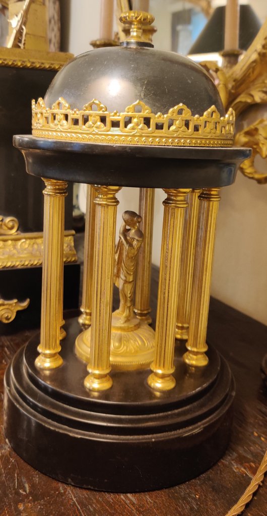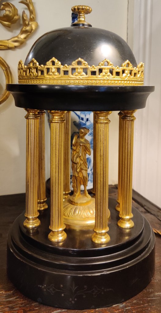 A pair of antique Palladio style classical black Marble and gilt ormolu garniture. Shaped in the manner of “The Tempietto” , S. Pietro in Montorio, Rome. Also similar to Edinburgh’s Dugald Stewart Monument. The garniture marble temples, Folly’s, depicting Greek /Roman gods in their centres. Measurements: 30cm high; 19cm diameter.