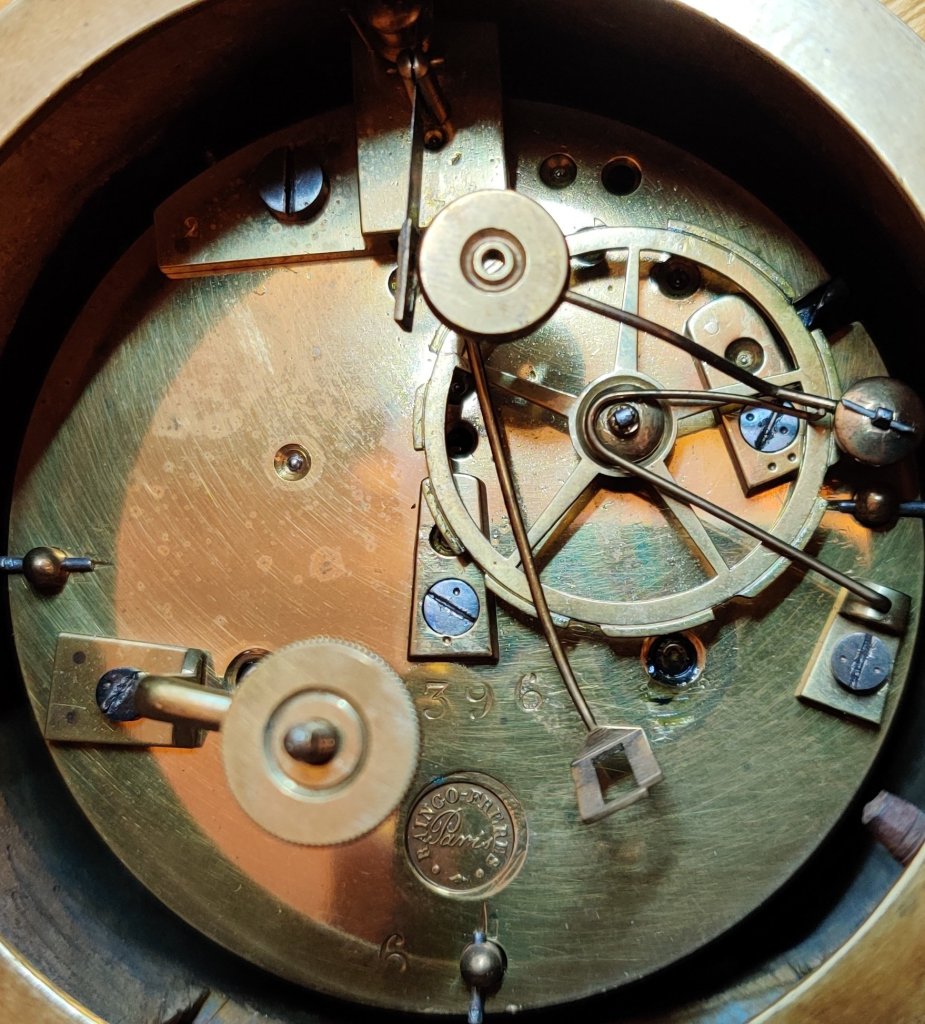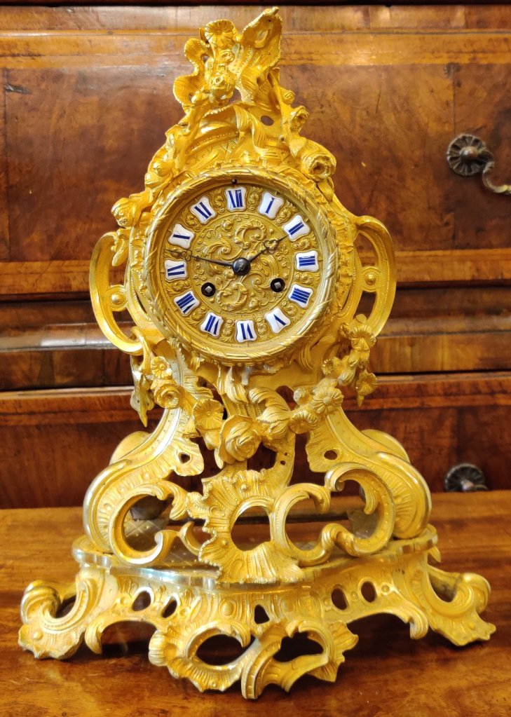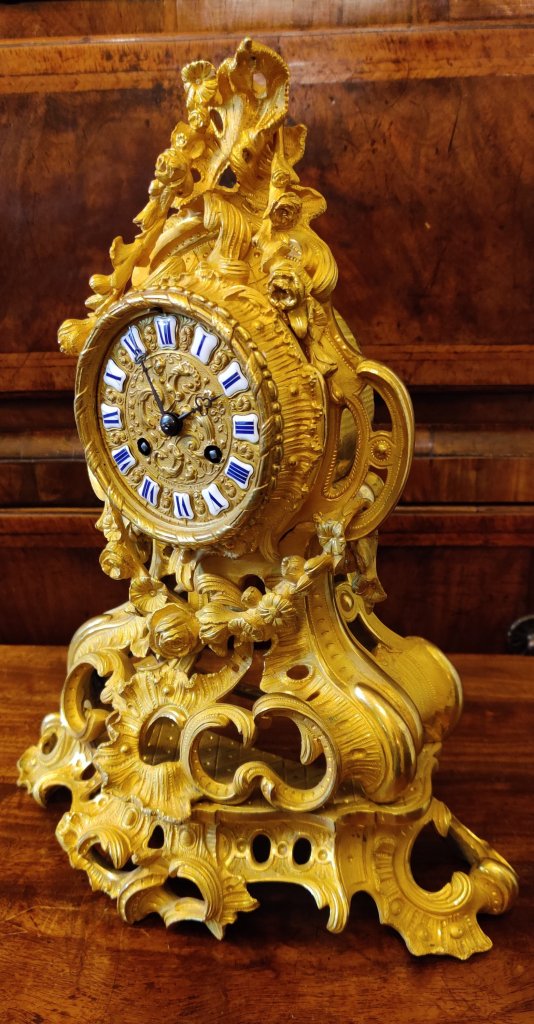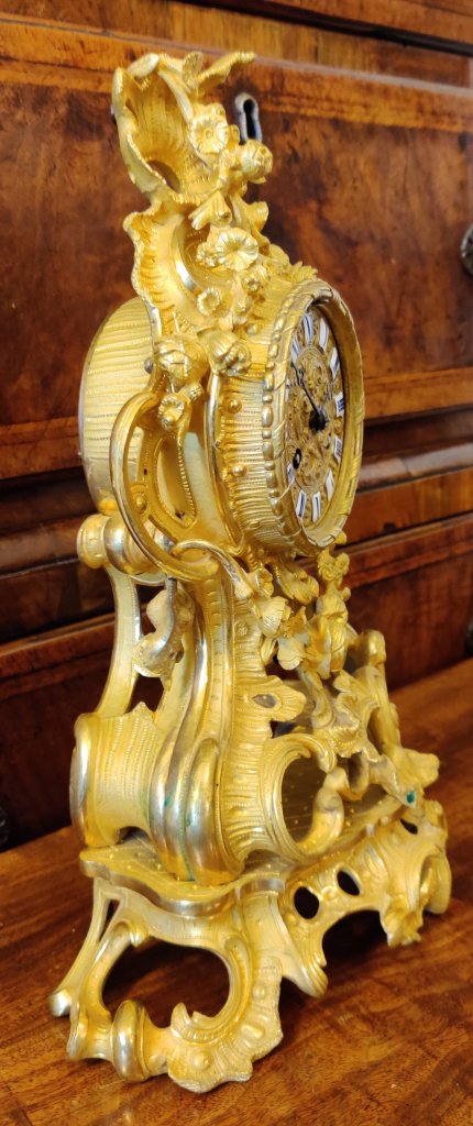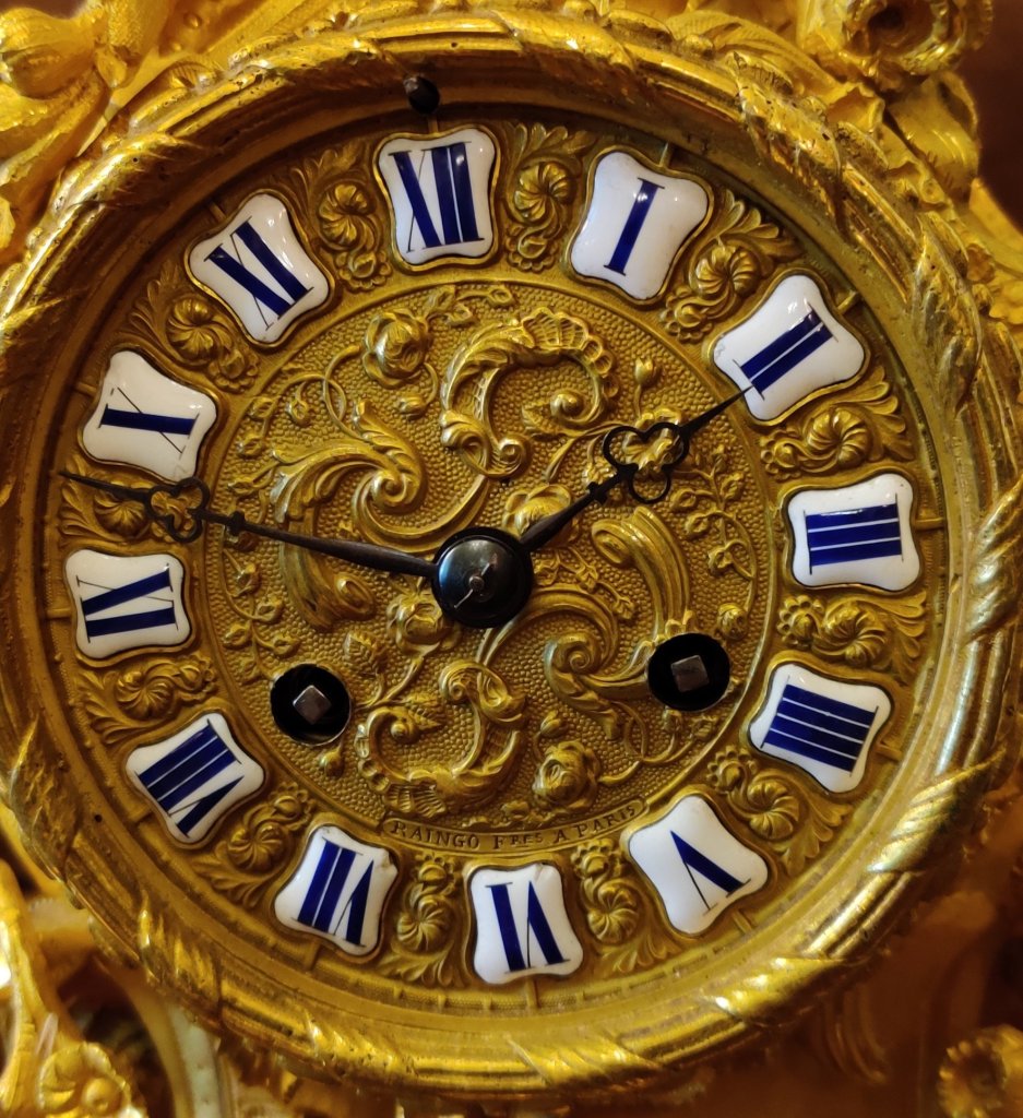French Gilt Bronze Rococo clock. 12 part gilded dial with enamel cartouches, depicting naturalistic foliage decoration. 8 day striking on a bell on the hour and the half hours. Outside countwheel. Circa 1840. Signed on dial and movement: “Raingo-Freres A’ Paris” .