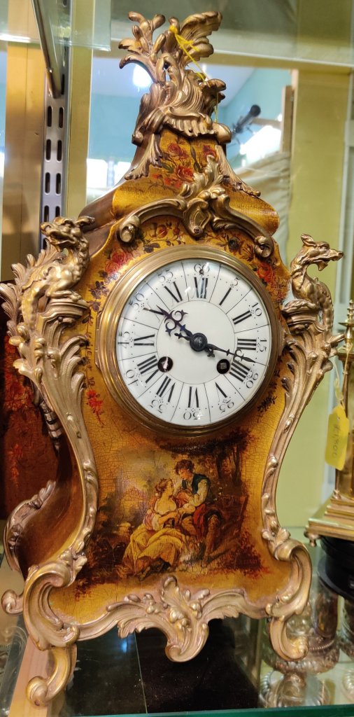 French wooden hand painted Vernis Martin clock with bronze gilt ormolu. The front showing a 17th couple in a garden. Circa 1890. The top corners of the clock decorated with mythical Dragons. 8 day movement, striking on a bell, on the hour and the half.