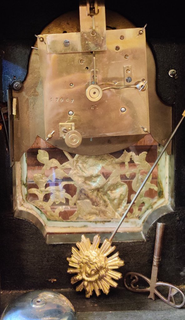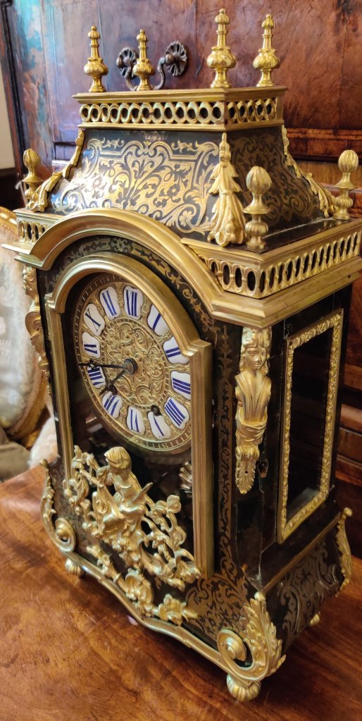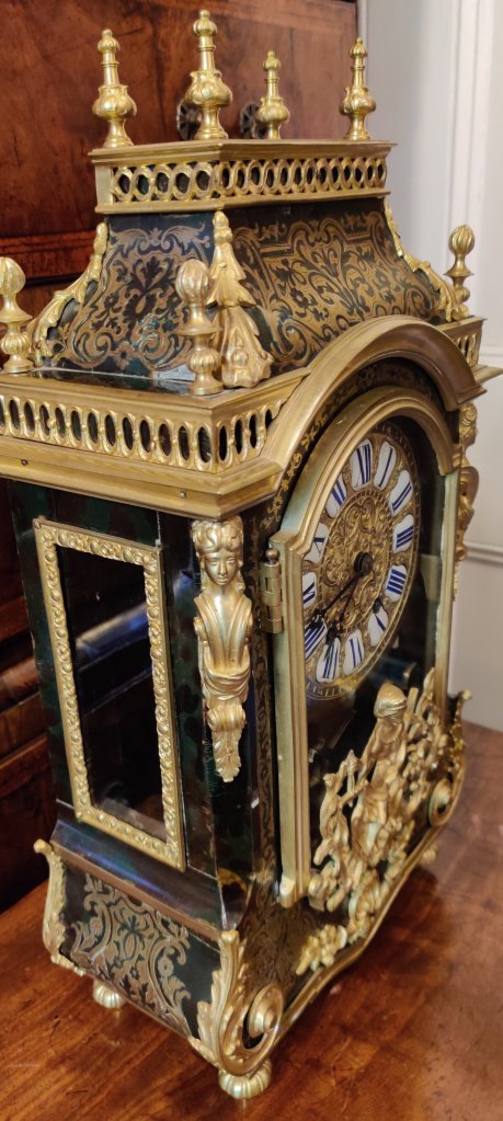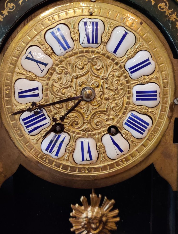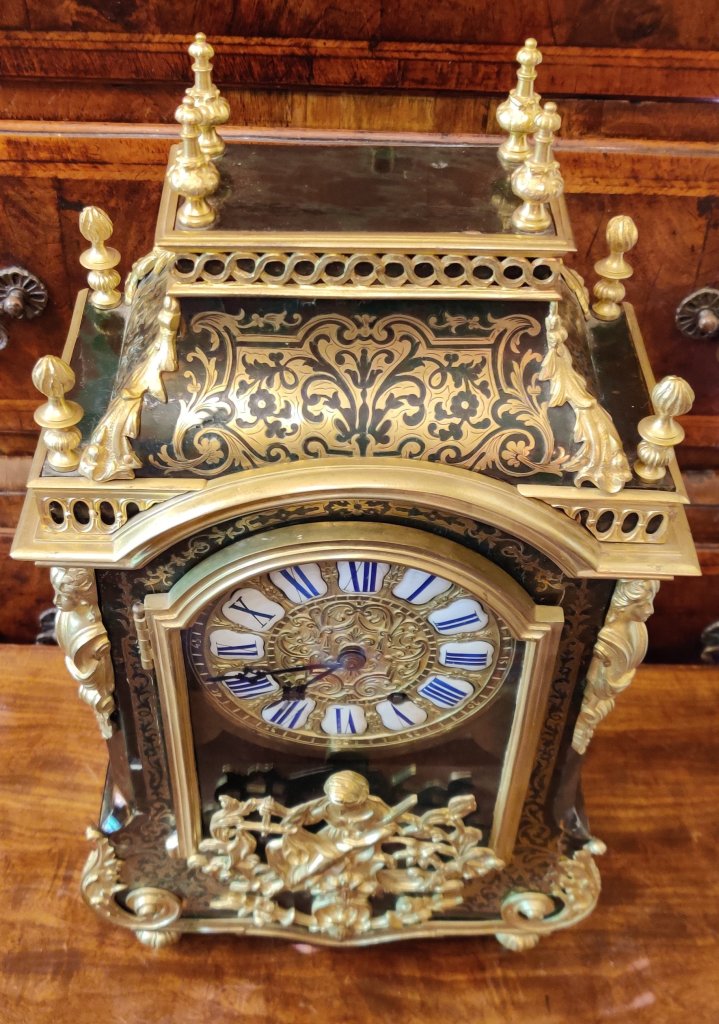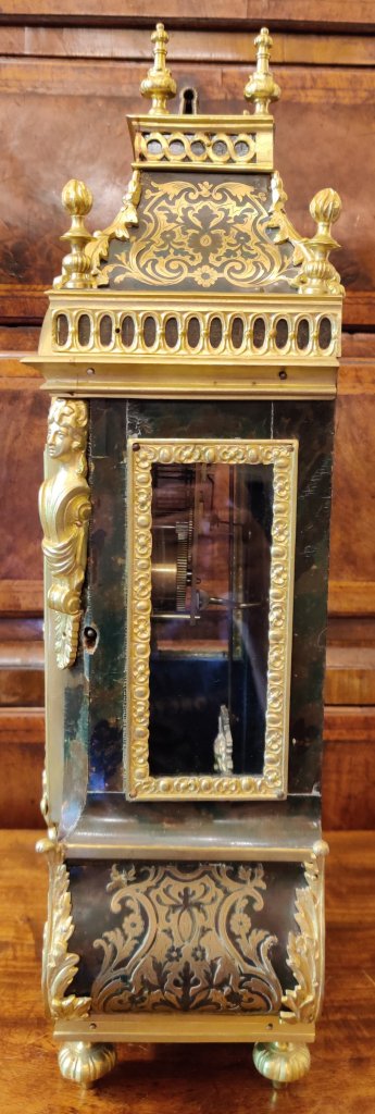 A Louis XIV style Boulle clock dating to the late-nineteenth century. Brown tortoiseshell veneer and finely engraved cut-brass marquetry, representing scrolling foliage and blossoms. With gilded bronze ormolu decorations. 12 part enamel cartouche numbers to detailed gilt bronze dial. Circa 1880. 8 day movement, striking on a bell, on the hour and the half. Measurements: 50h x 17w x 13 depth cm. Circa 1880.