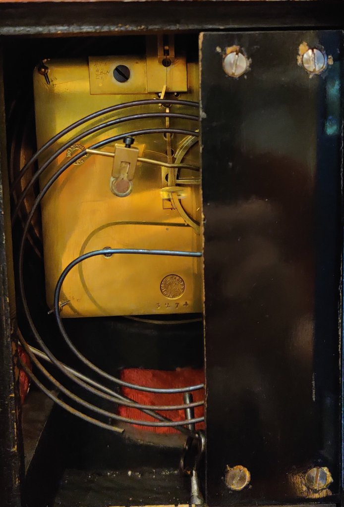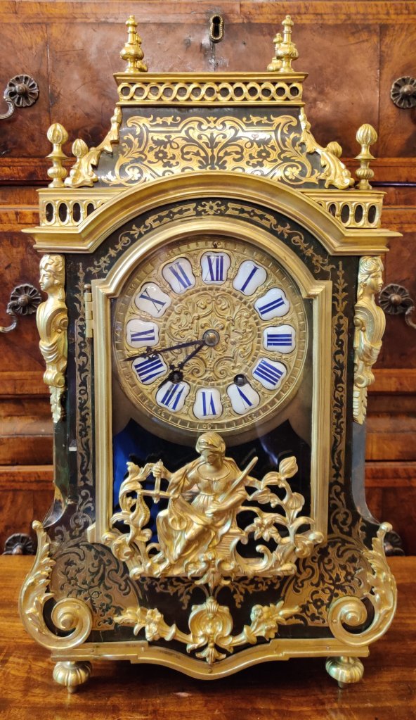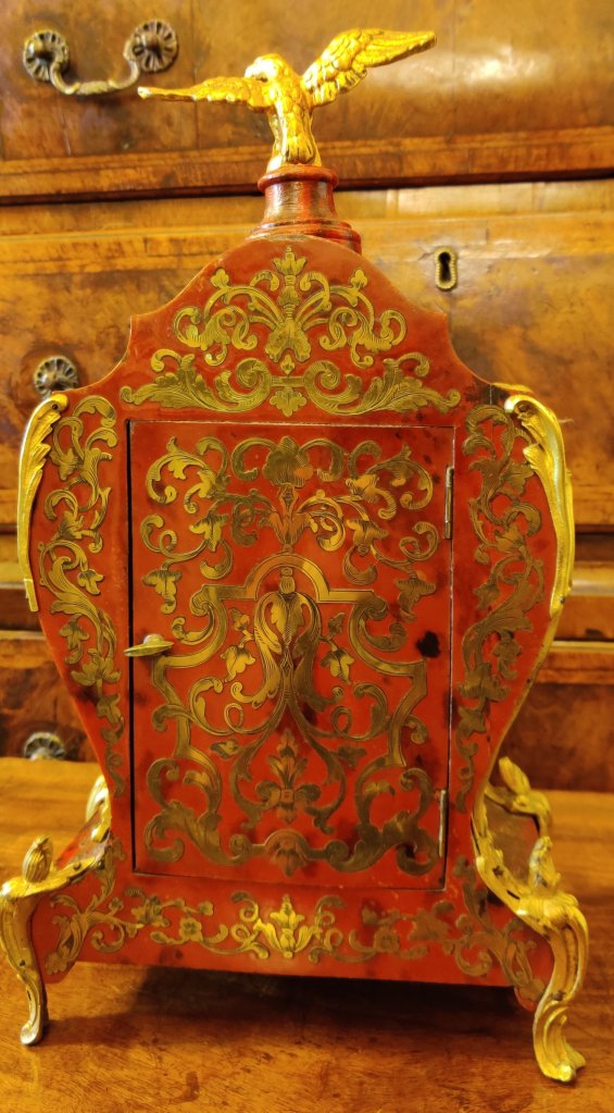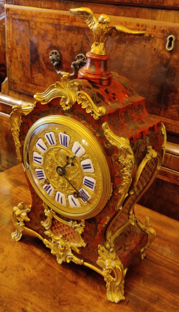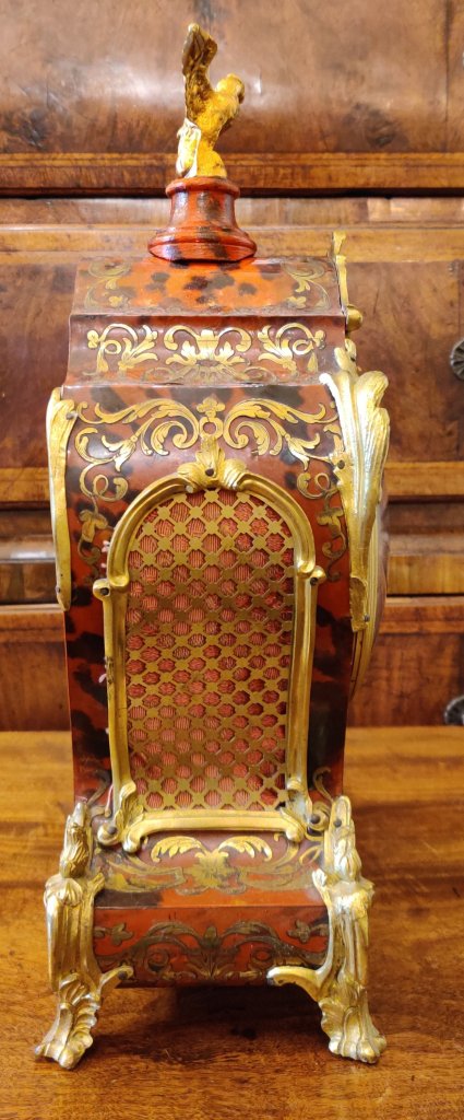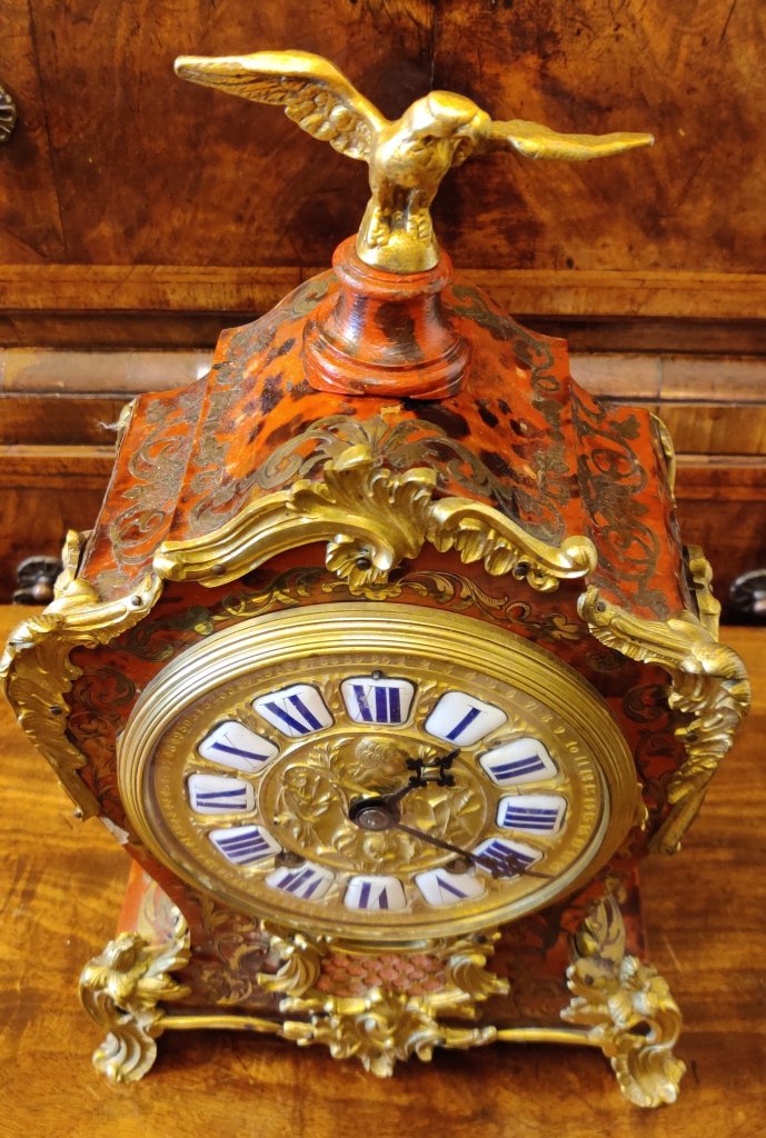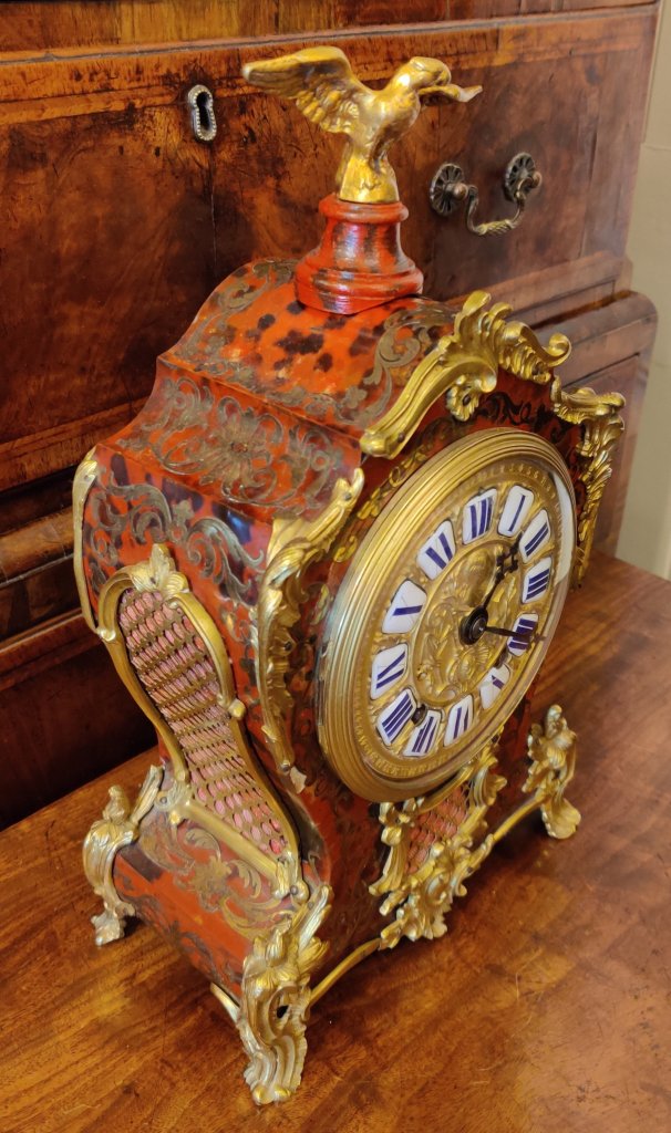 Louis XIV style Boulle clock dating to the late-nineteenth century. Red tortoiseshell veneer and finely engraved cut-brass marquetry, representing scrolling foliage and blossoms. Also Boulle to sides & reverse of clock. With gilded bronze ormolu and topped by an Eagle. 12 part enamel cartouche numbers to detailed gilt bronze dial. Circa 1880. Case waisted. 8 day movement, striking on a bell, on the hour and the half. Movement stamped “Delettrez A’ Paris”. Movement No. “3274” Jean-Baptiste Delettrez was a well known clockmaker working in Paris, in the late 19th century. Measurements: 39h x 23w x 12 depth cm. Circa 1880.