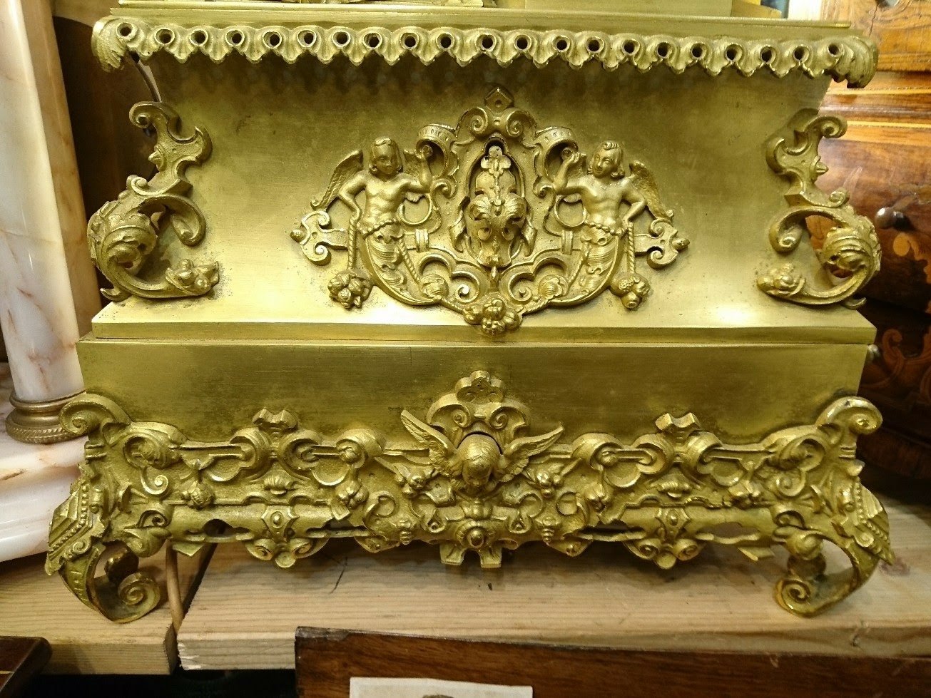 dsc_5145-1305×979545270123.jpg Female pointing at font of Holy Water, Gilt Bronze French Clock. inscription on dial “Brevet De Perfection” Farret a’ Paris.