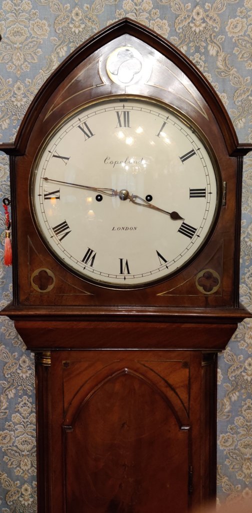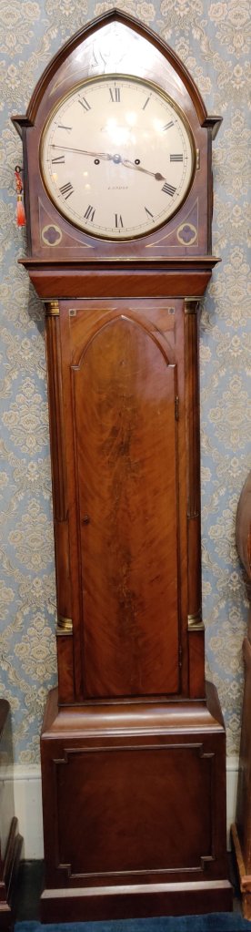 A RARE Georgian Lancet topped Longcase Clock. Circa 1810. 8 day movement with chime/silent leaver in the arch. The highest quality regulator style movement (see pictures). The case of the finest quality figured Mahogany with gothic trunk door and brass inlay throughout. The white enamel dial Signed, “Copeland , London”. Alexander Copeland is listed in Baillie’s Watchmakers and Clockmakers of the World, as being a member of the prestigious Clockmakers Company between 1804-1824. Dimensions: 202 cm high; 47cm max wide x 22cms. max deep.