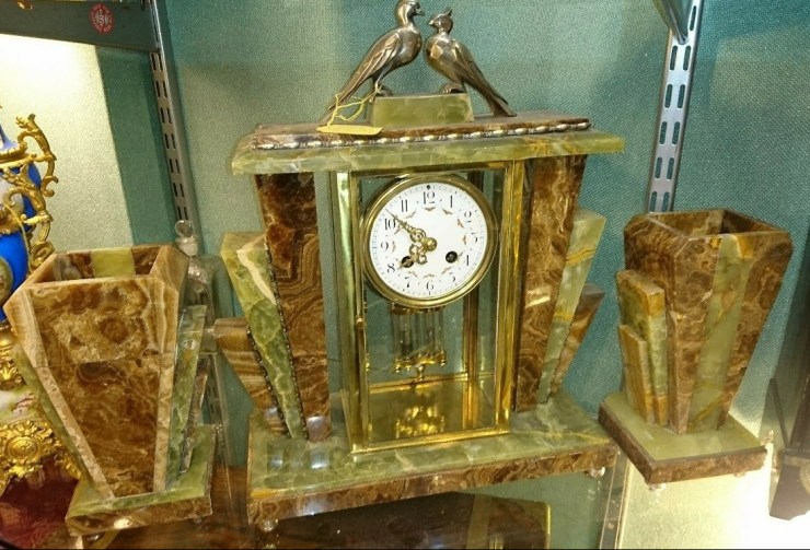 Art Deco Onex Marble clock Garniture, French. 4 glass, with mercury pendulum. 8 day, striking on the hour and the half hour. 8 day movement striking on a gong. Circa 1920.