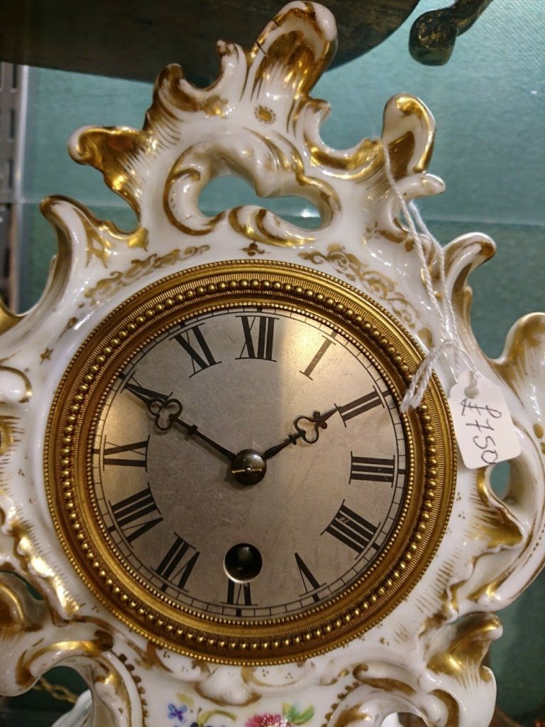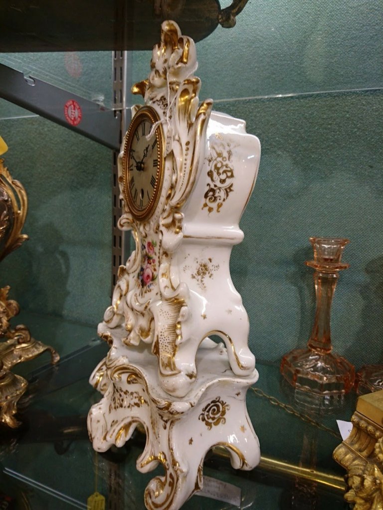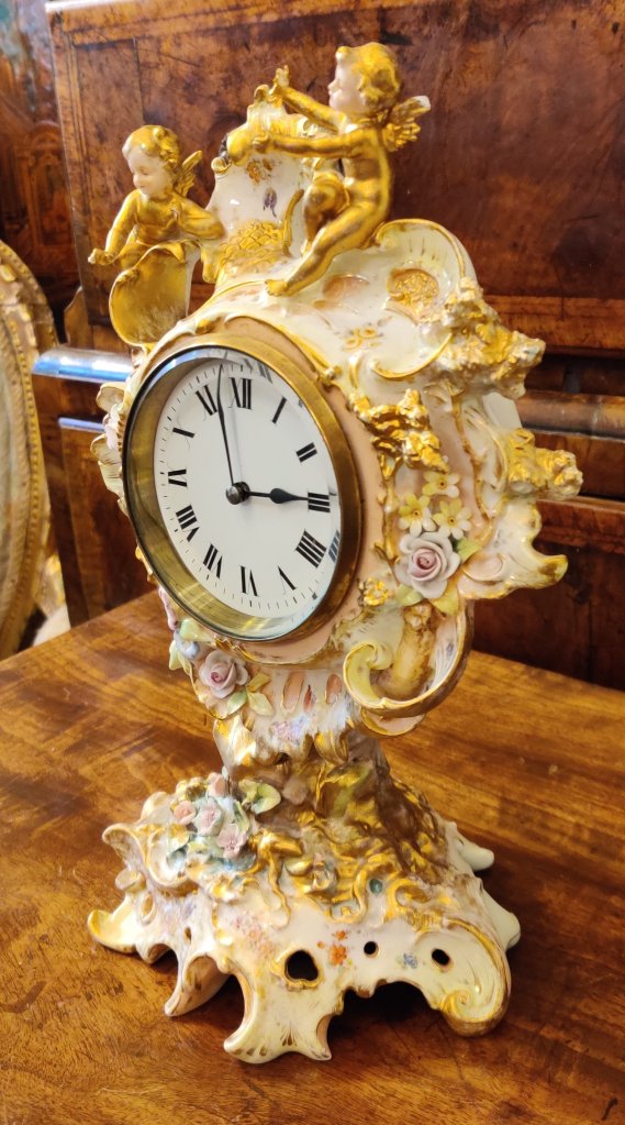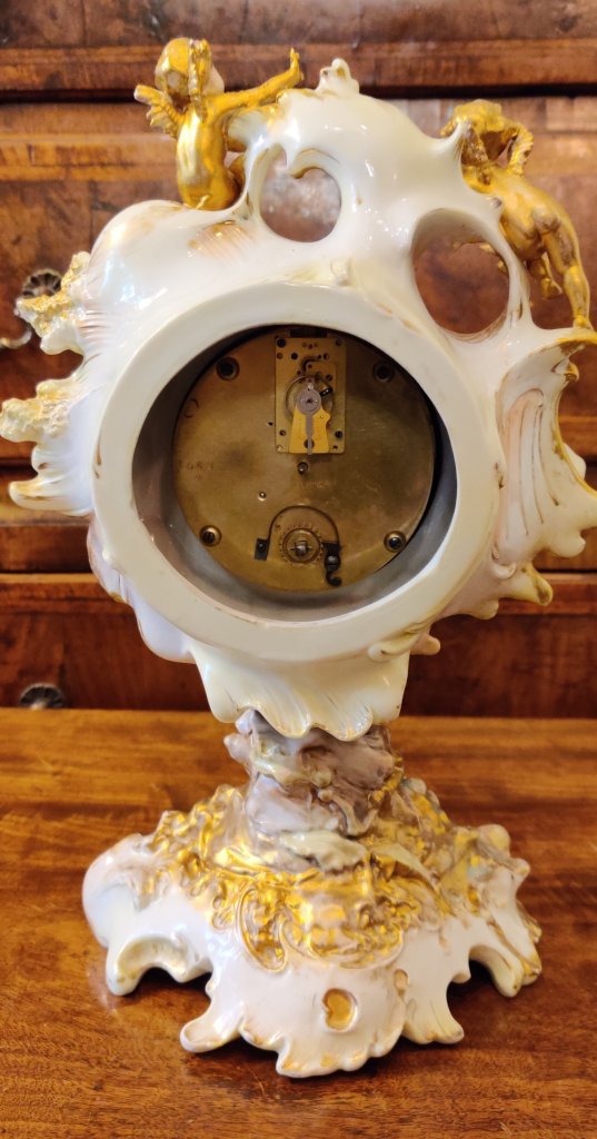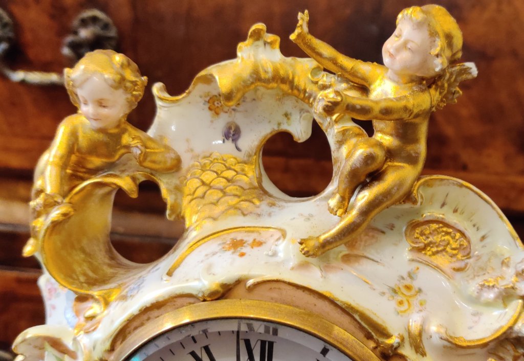 French server style porcelain Mantle clock/timepiece. Depicting two cherubs amongst flowers and creepers. Circa 1890. 8 day. Measurements: 31h x 17w x 14.5 depth cms.