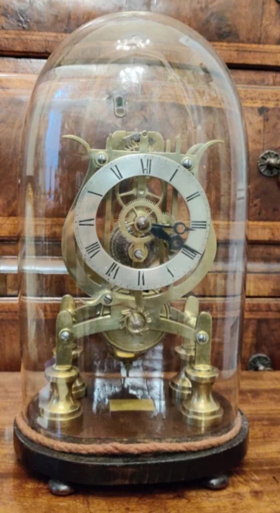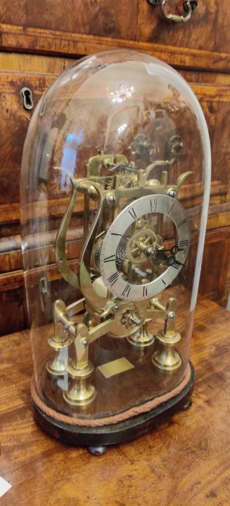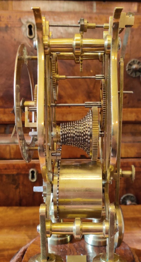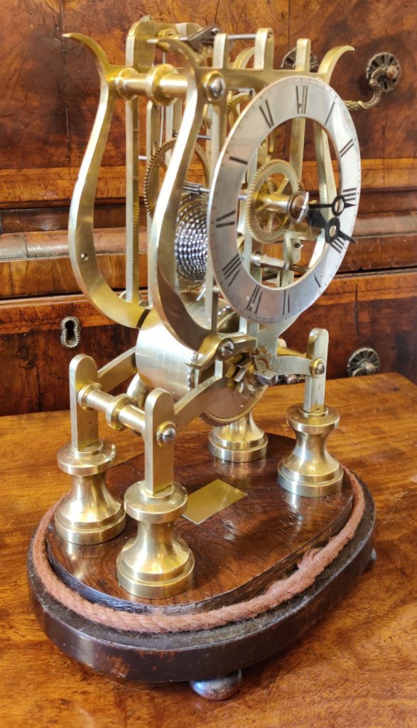 Skeleton clock, early 19th century, 8 day with chain driven brass movement. Measurements: 37cm high; 20cm wide; 16cm deep.