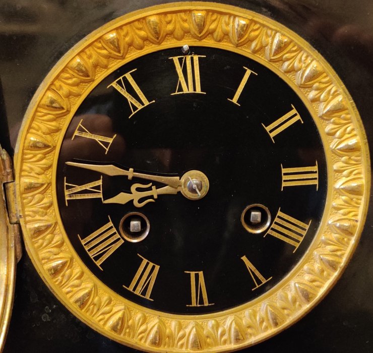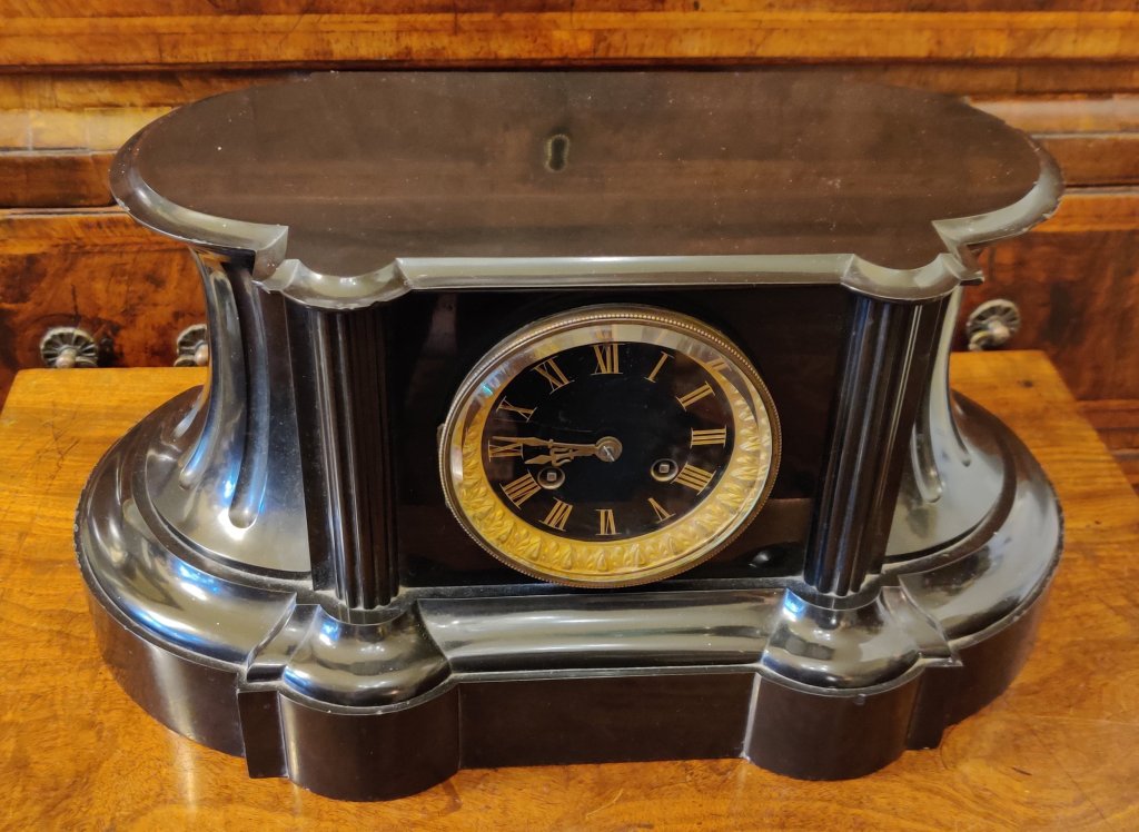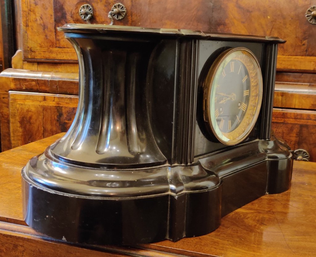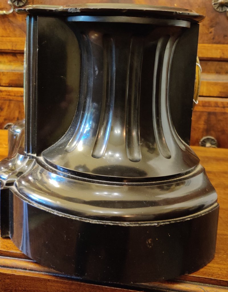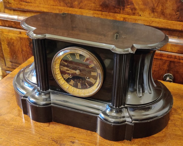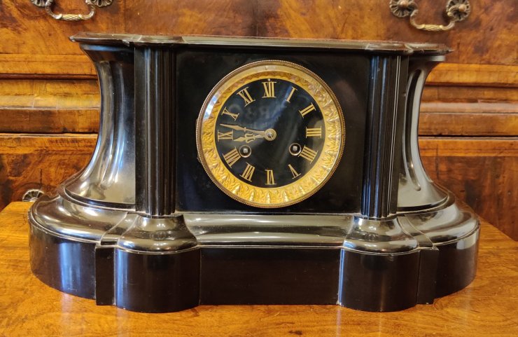 French Black Marble Mantle clock. Circa 1880. High quality with marble dial with gilt surround. 8 day. Outside countwheel, striking on a bell, on the hour and the half. The top flat, in order to allow owners own decorative figure to be displayed, if so wished. Measurements: 22h x 43w x 20 depth cms.