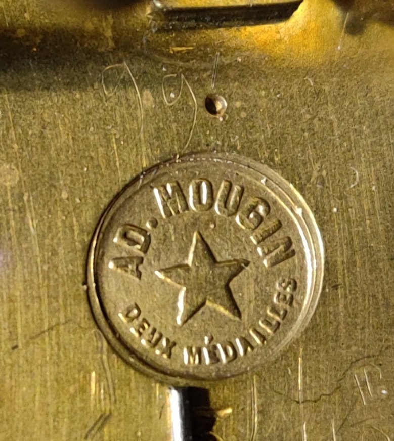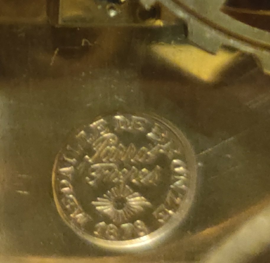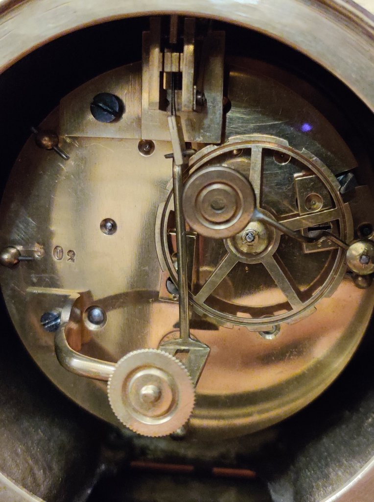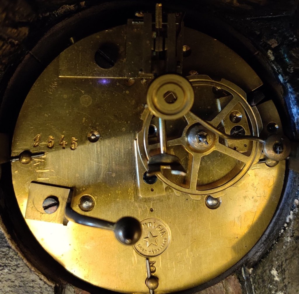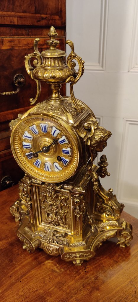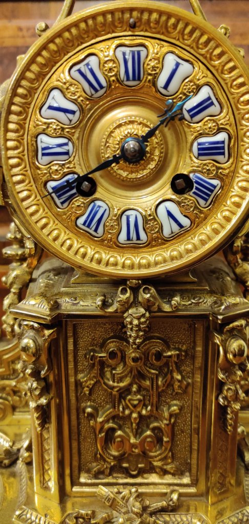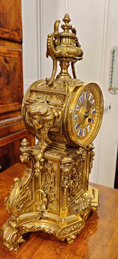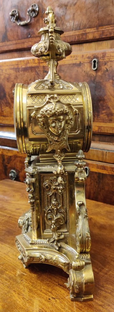 French Lacquered brass mantel clock with gilded 12 part dial with porcelain cartouches depicting the hours. Stamped on the movement, by the famous Clock maker: “JAPY FRERES,MEDAILLE DE BRONZE 1873” . 8 day movement with outside countwheel striking on a bell, on the hour and the half. Circa: 1880.