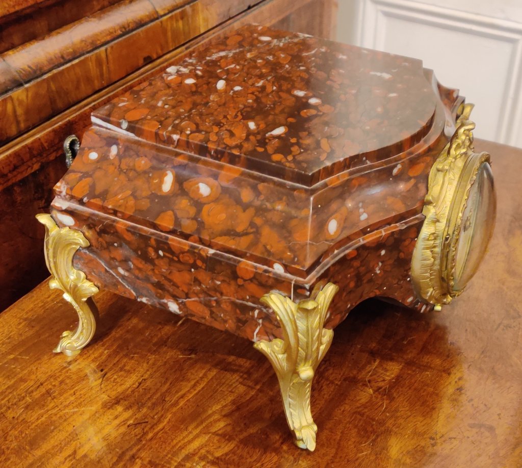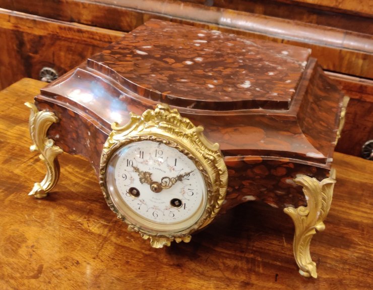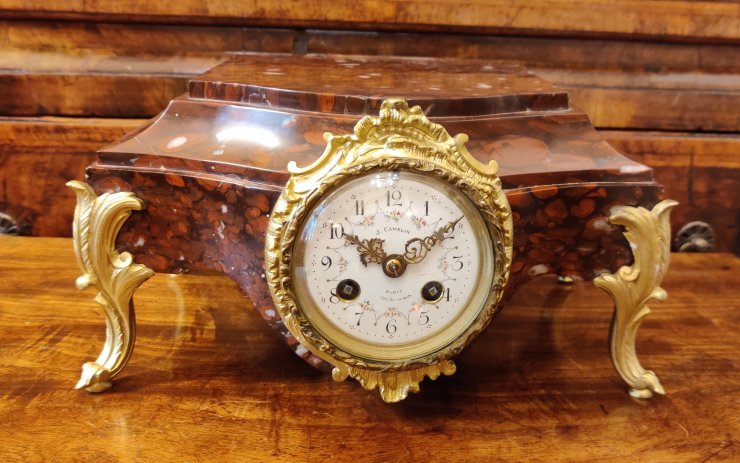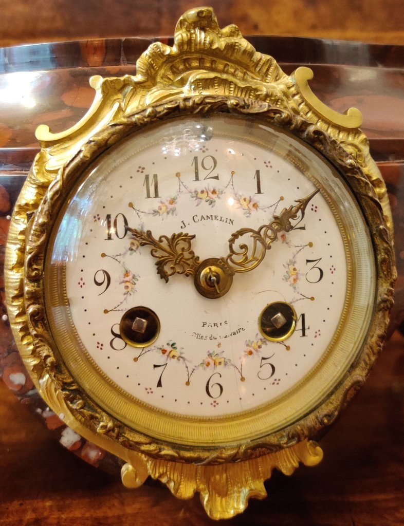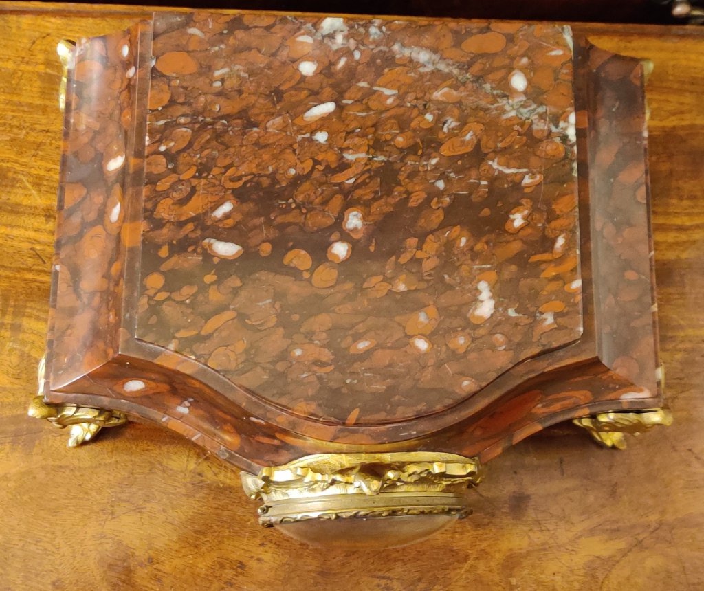 Rouge marble gilt ormolu Mantle Clock / Stand, for Bronze or porcelain figure. The flat top can remain clear or show off a prized bronze etc. Circa 1880. Signed on the dial “J. Camelin Paris”. Outside countwheel, striking on a bell, on the hour and the half. Measurements: 15h x 27w x 21depth cm.