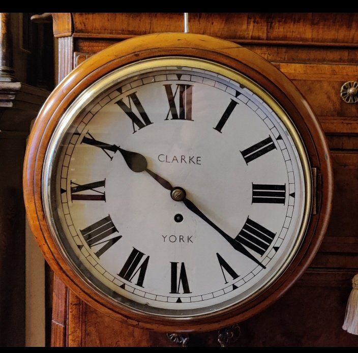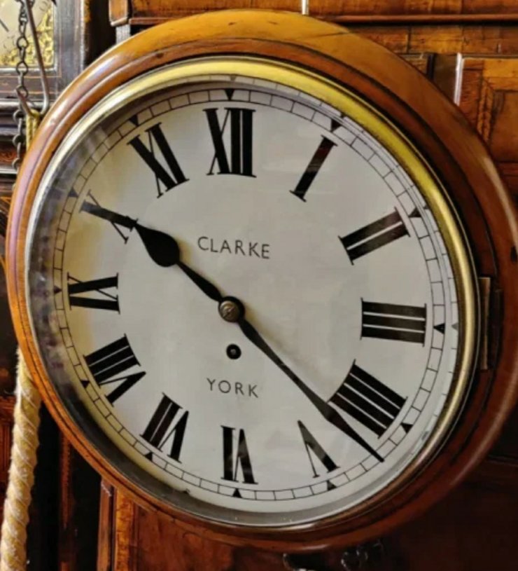 A single chain fusee Dial / Station clock. Mahogany case, mechanism of 8 day duration. Cast brass bezel with bevelled glass. 12 inch enamel dial signed by “Clarke York”.