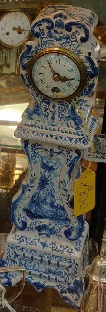 A Delf porcelain blue and white clock in the form of a miniature Grandfather Clock. A rare French example. 8 day. Approximately 32cm high