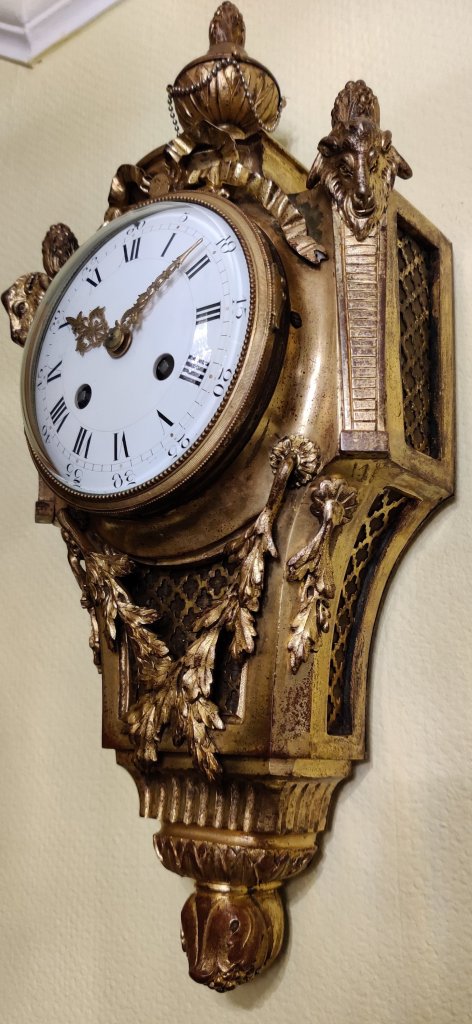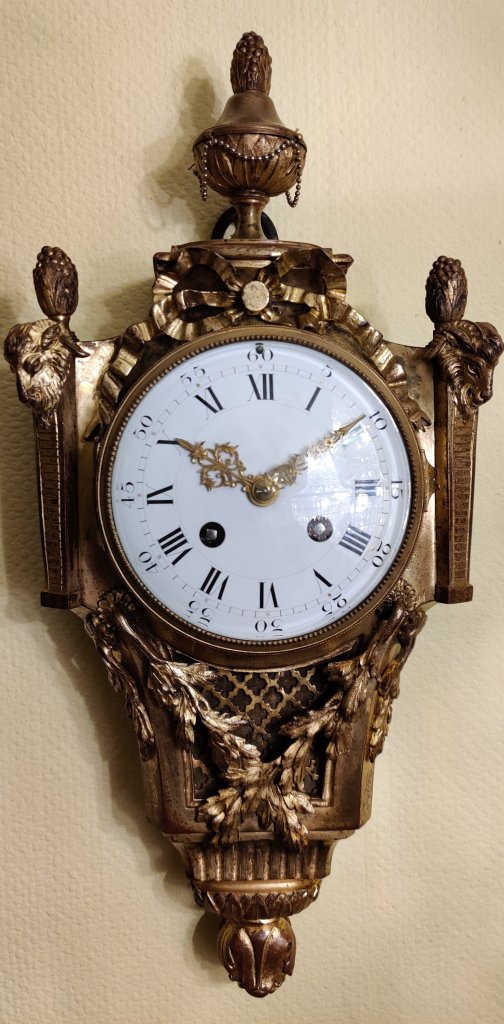French Gilt Bronze Cartel Clock, with a 10.5 cm enamel dial. Signed on the dial “Samuel Marti, Paris”. Striking on a bell, on the hour and the half.Measurements: 40h x 18w x 10 depth cm.